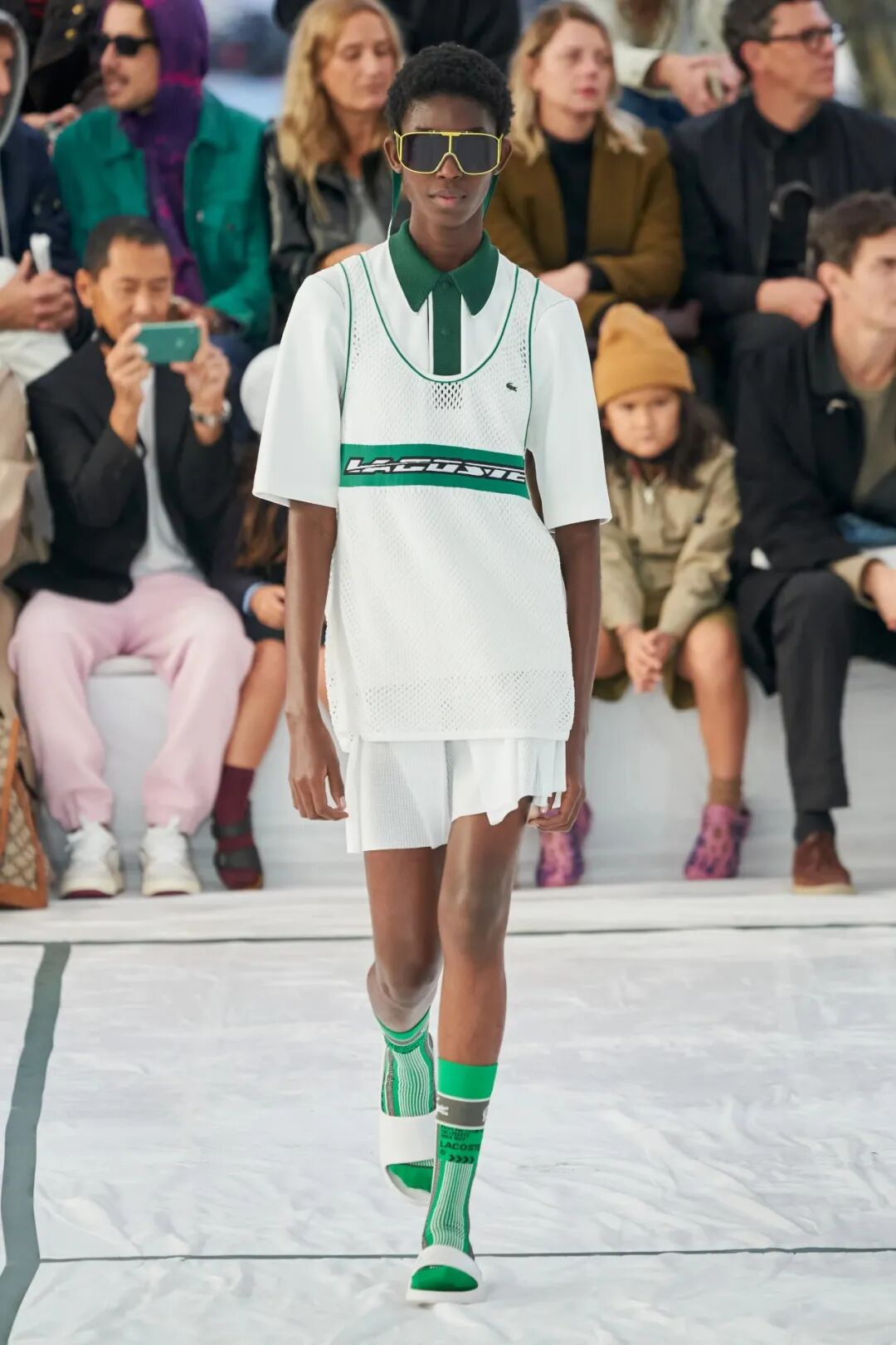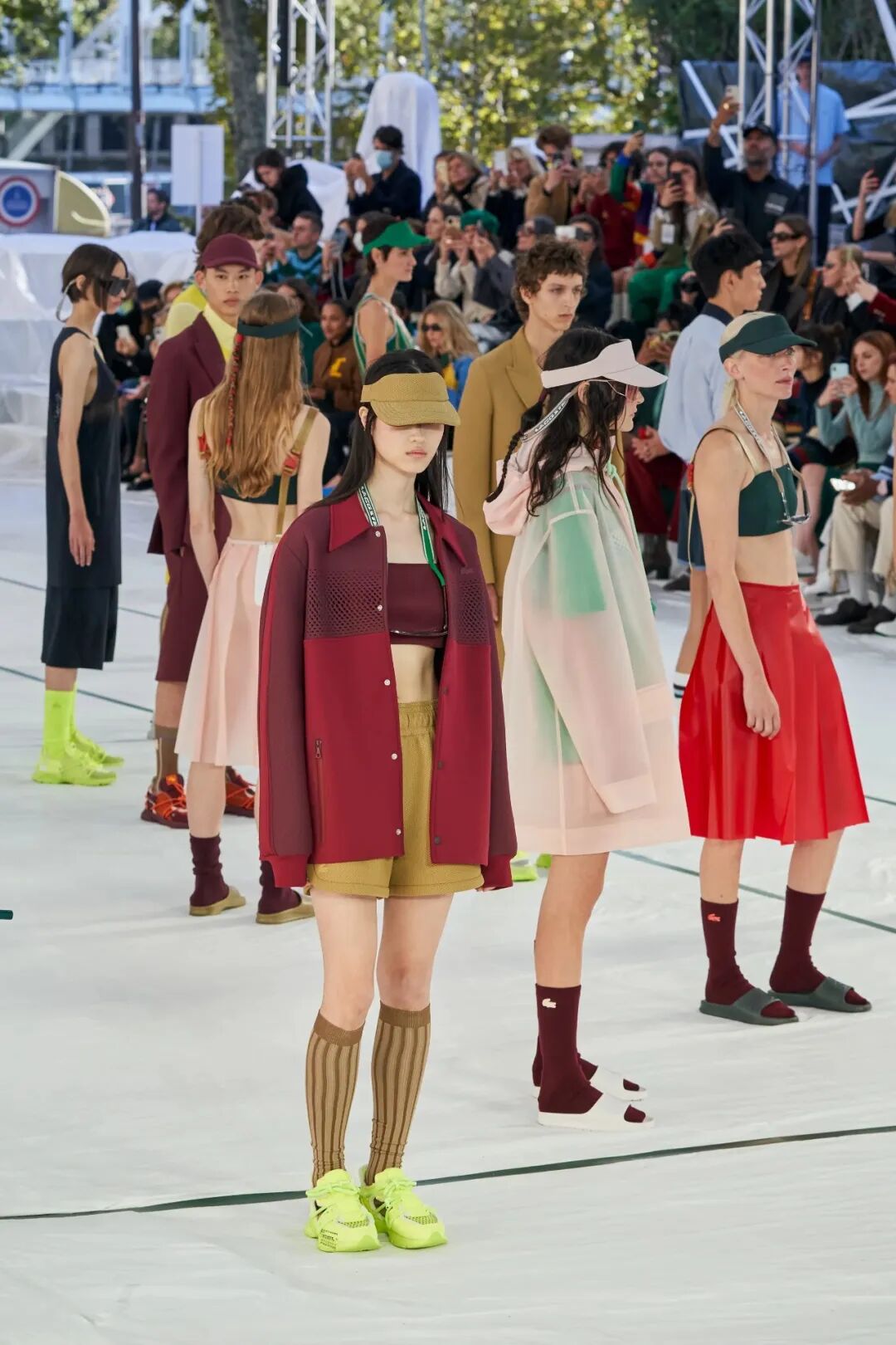 短裤样式的西装概念从运动服的改造而来,百褶裙有了雾面粉彩,Lacoste Polo衫亦开始出现了针织设计。整个系列用色新颖精准,富有艺术感同时又具有轻松玩味有态度。