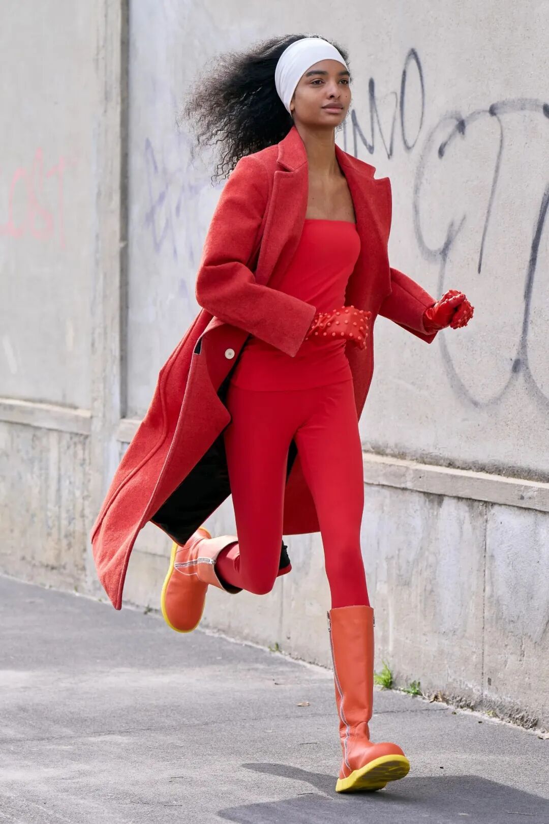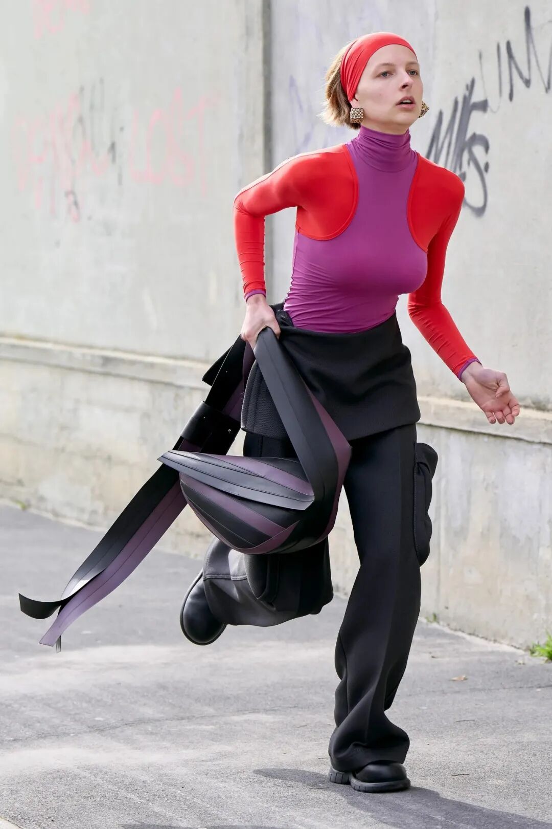同样是高饱和的色彩冲撞与拼接,针织连衣短裙与黑白纯色小高领的搭配,高街运动风扑面而来。