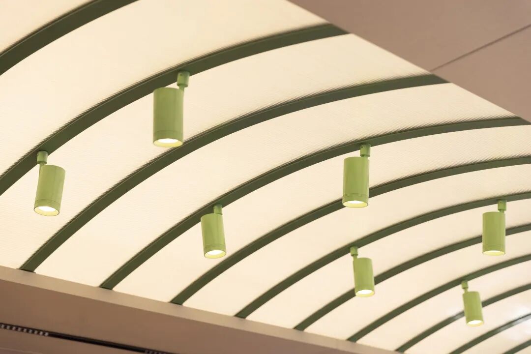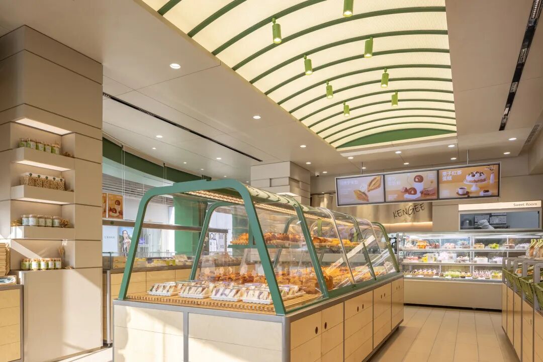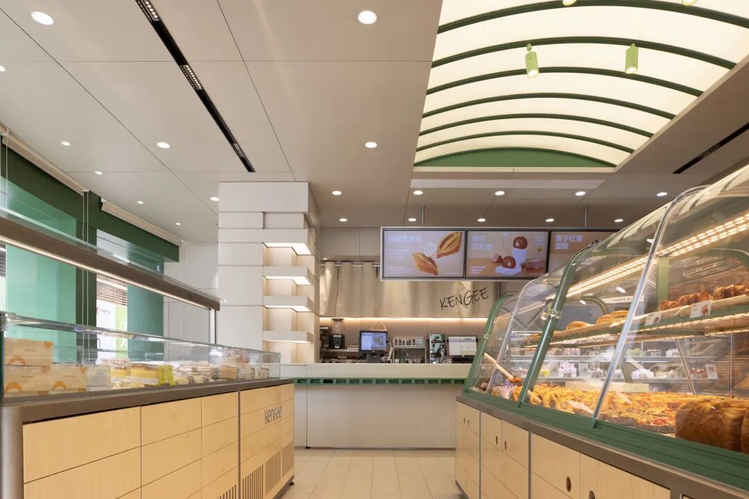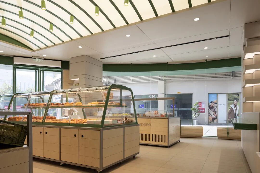 从形似棚架的弧形顶部上撒下温暖而均匀的顶光,和中岛的现烤柜一起成为了整个空间的视觉核心。