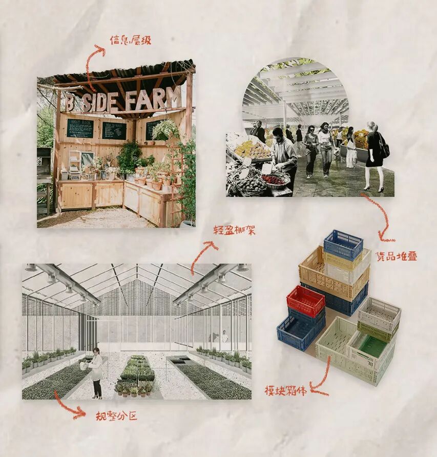 通过板条箱、塑料筐堆叠,模拟出农场中丰收的景象,展陈丰富又层级分明。