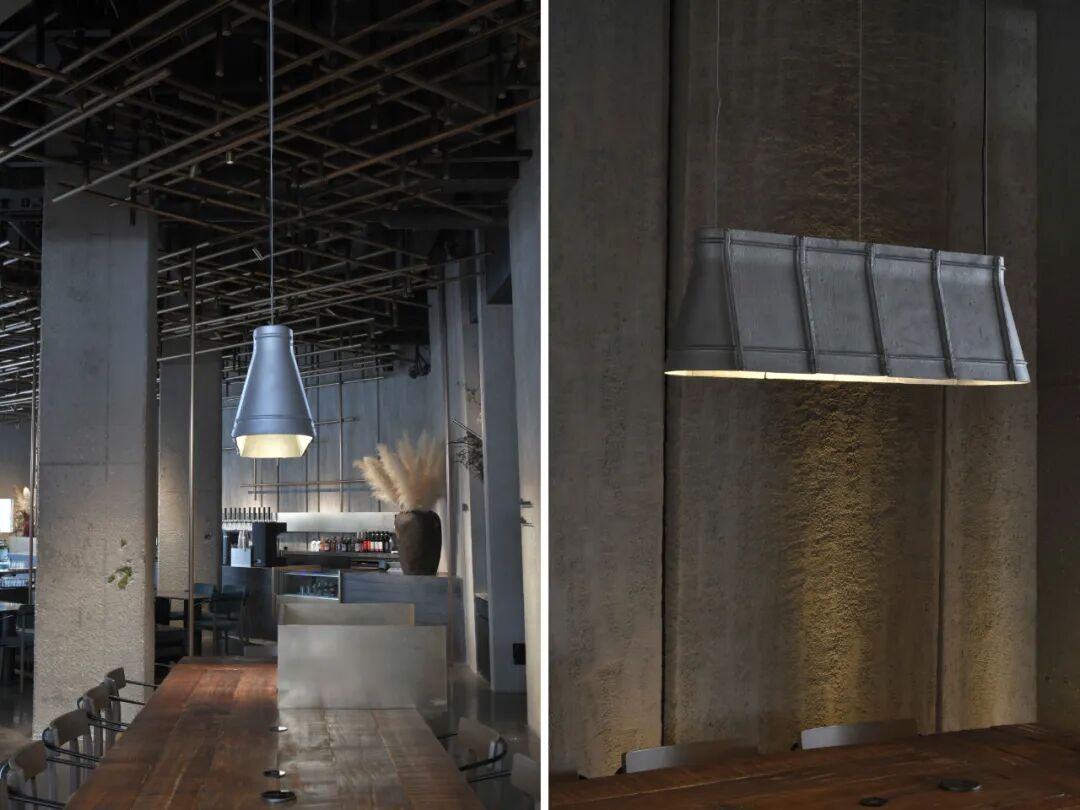 光亦是柔软空间氛围的重要笔触,「DECK甲板」空间中运用到的吊灯,体态酷似矿井中用到的运石车或是勘探灯,但垂挂在空间内输送光亮的姿态静美端庄极了。