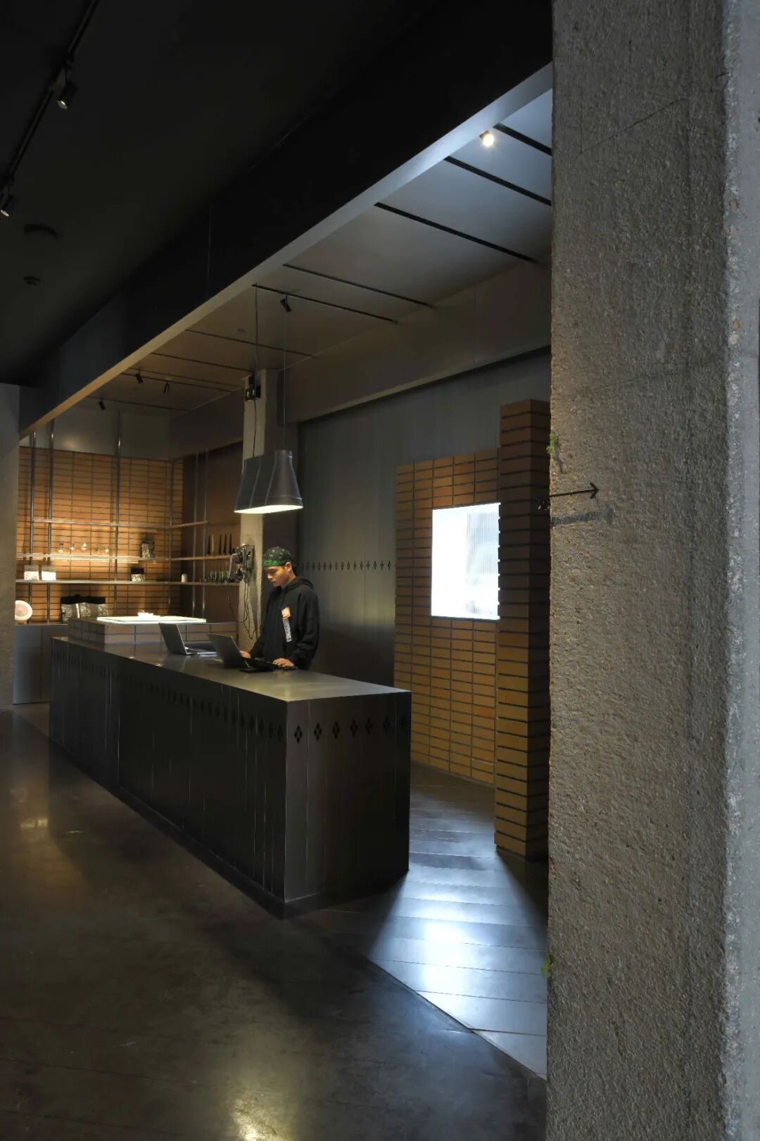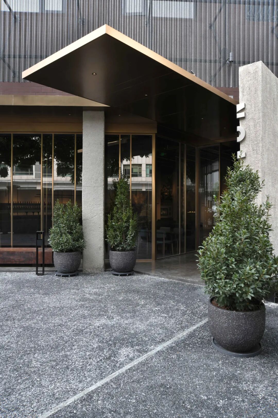 酒店入口尽管藏得略深,但利用一道从入口延展而出的“加长”黄铜雨棚,作了明晰的指引。由于底楼空间基本留位给了「DECK甲板」(融合了餐饮、休闲和社交的多元空间概念,在北上皆有独立分号)。