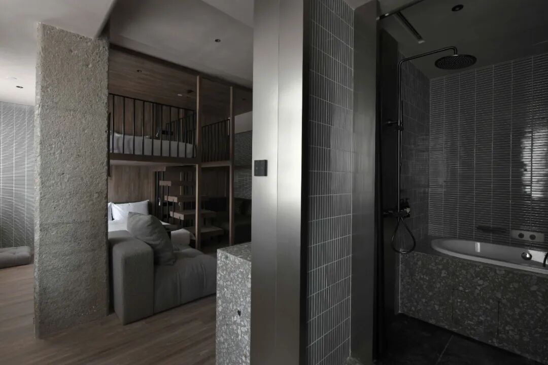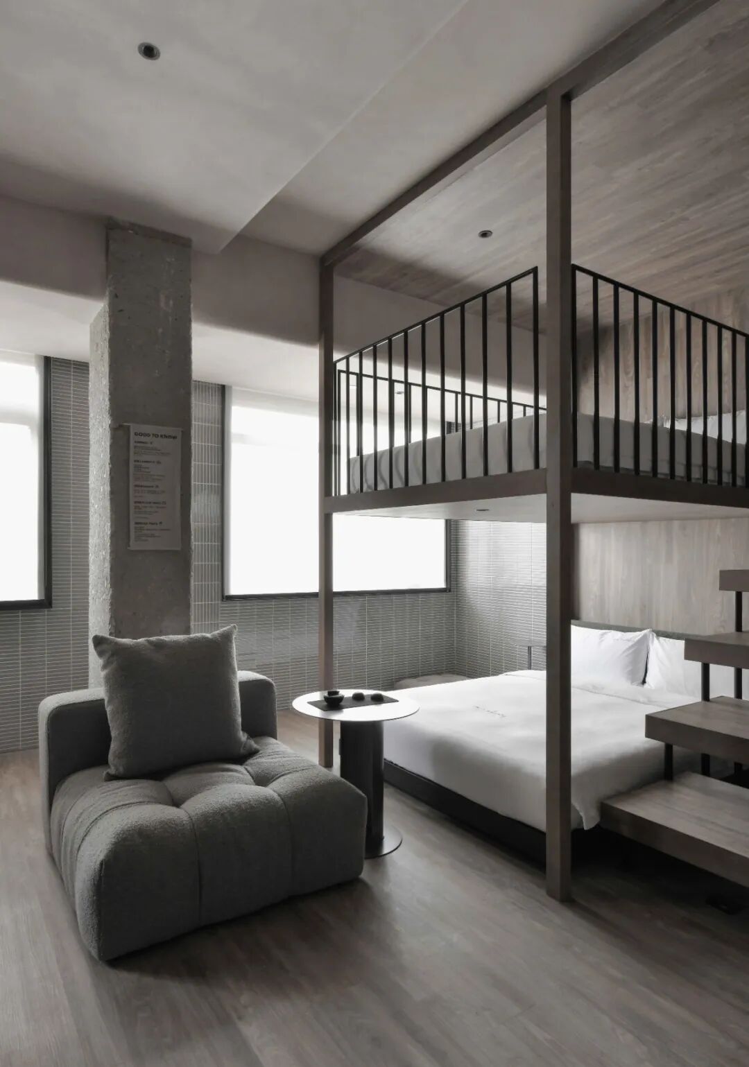 深圳NOA还推出了一款更为有趣的房型,对上下铺和复式概念进行了变通——让两张叠放的双床由一组木质台阶衔接。最终呈现效果更舒适也更务实,很好处理了结伴出行和派对需求。