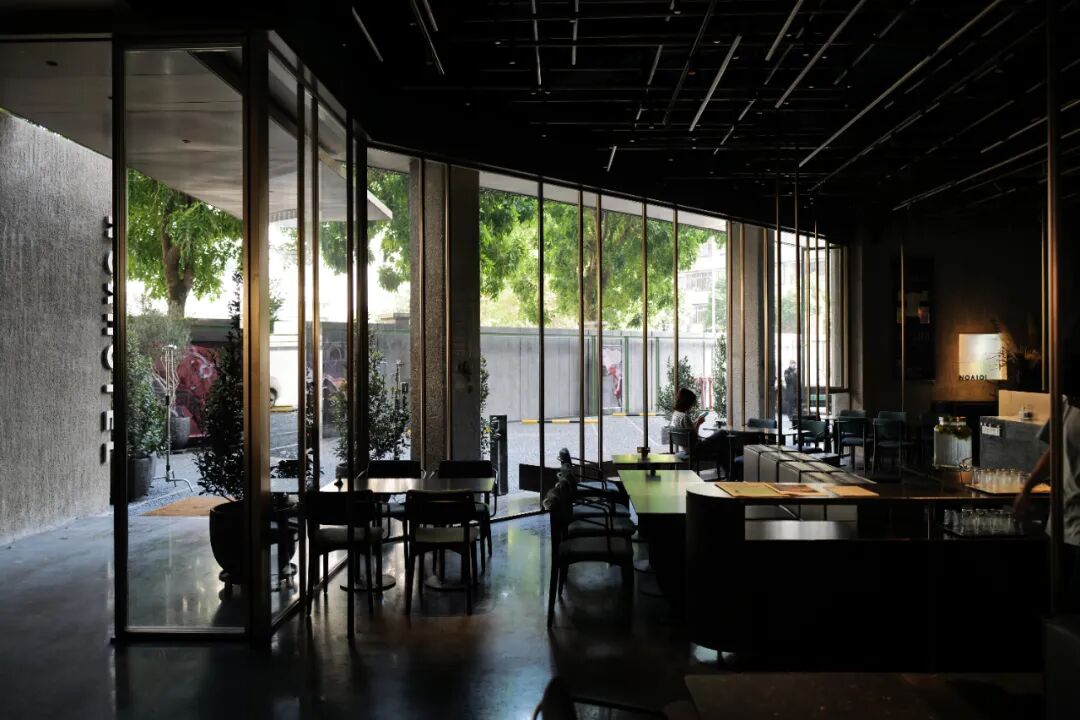 ▲ 深圳NOA的门脸藏在一条幽深的院落里,但在临街处立了标识牌,标识牌的铝框顺着院落的墙垣一路延展到酒店后院,形成了很强的体系感,也与一墙之隔的地质研究院的绿意相映成趣(下图)。