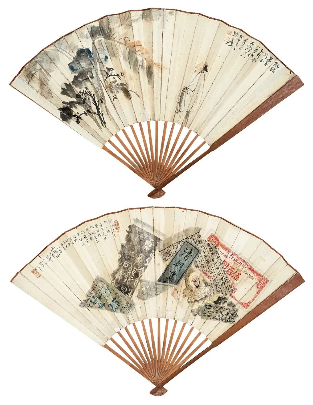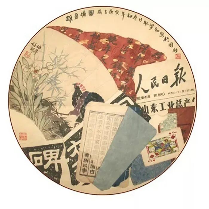 画面上折起的画片,残烧的画幅、瓦当、扇面等物品,交错重叠呈现出逼真的视觉效果,作品故意在交叠处和边沿处晕染,创造出了三维空间的效果。