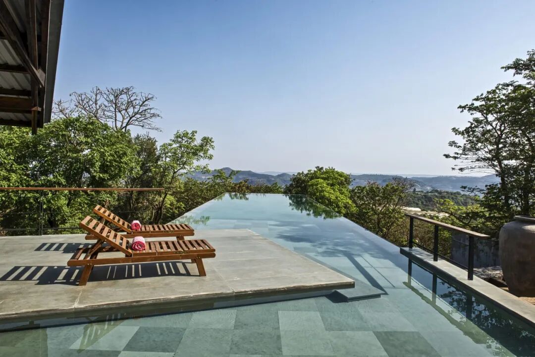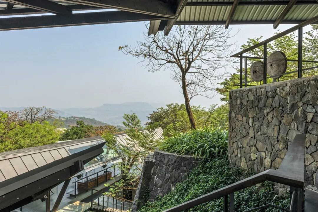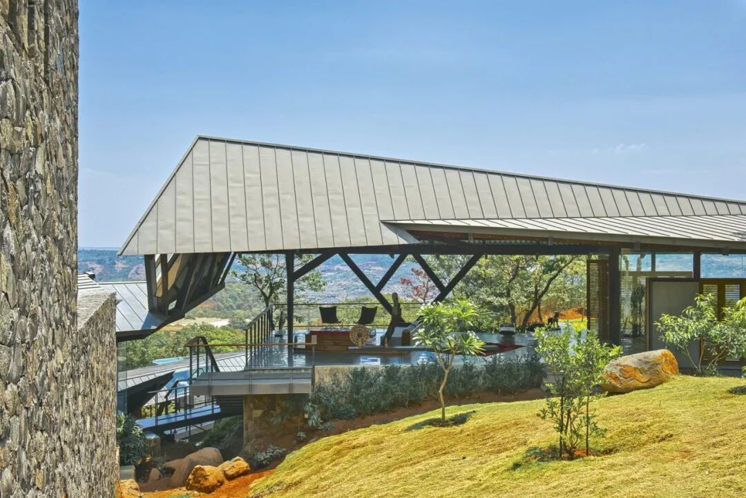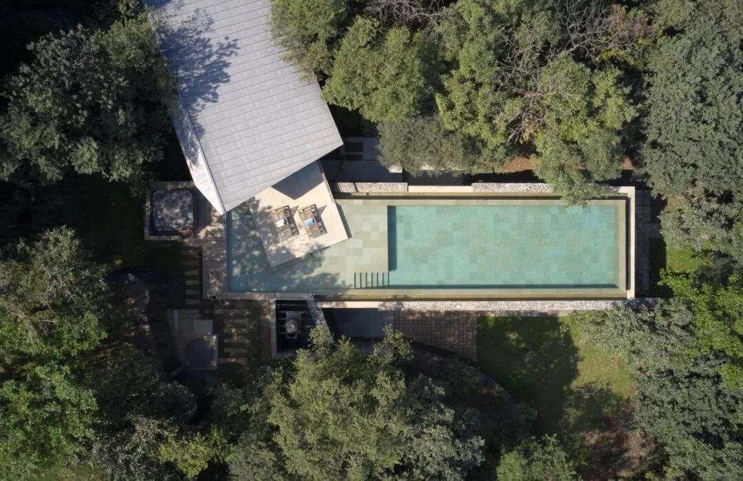 The private spaces are banked into the southern edge of the main ridge, overlooking the large ravine/monsoon stream. A large stone wall running from south to north along the ridge binds these spaces but breaks open to allow east-west breezes and landscape to flow horizontally. The dense forest on the west, shades these spaces and the south west corner rises above the land to shield the house from the afternoon sun. The placement of two bedrooms below the pool ensures natural cooling, while the orientation of the pool along the axis of the spine allows the breeze to be cooled before travelling through the house. The elevation of the pool also minimises the likelihood of rats/ frogs/ snakes in the warm/ dry summer months.