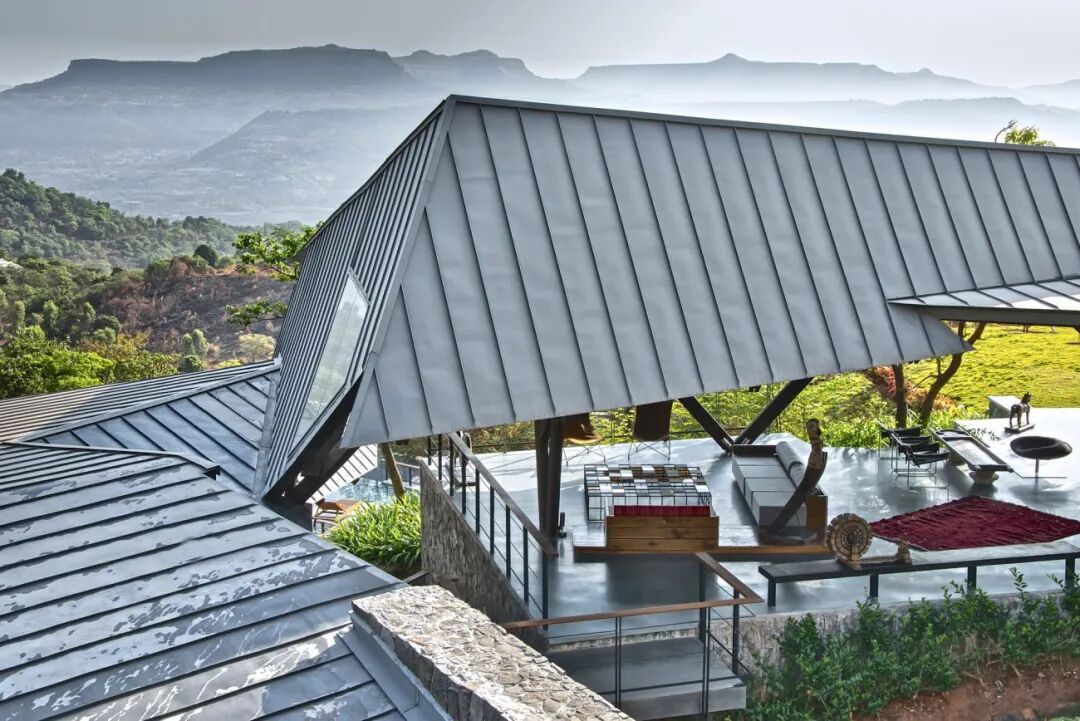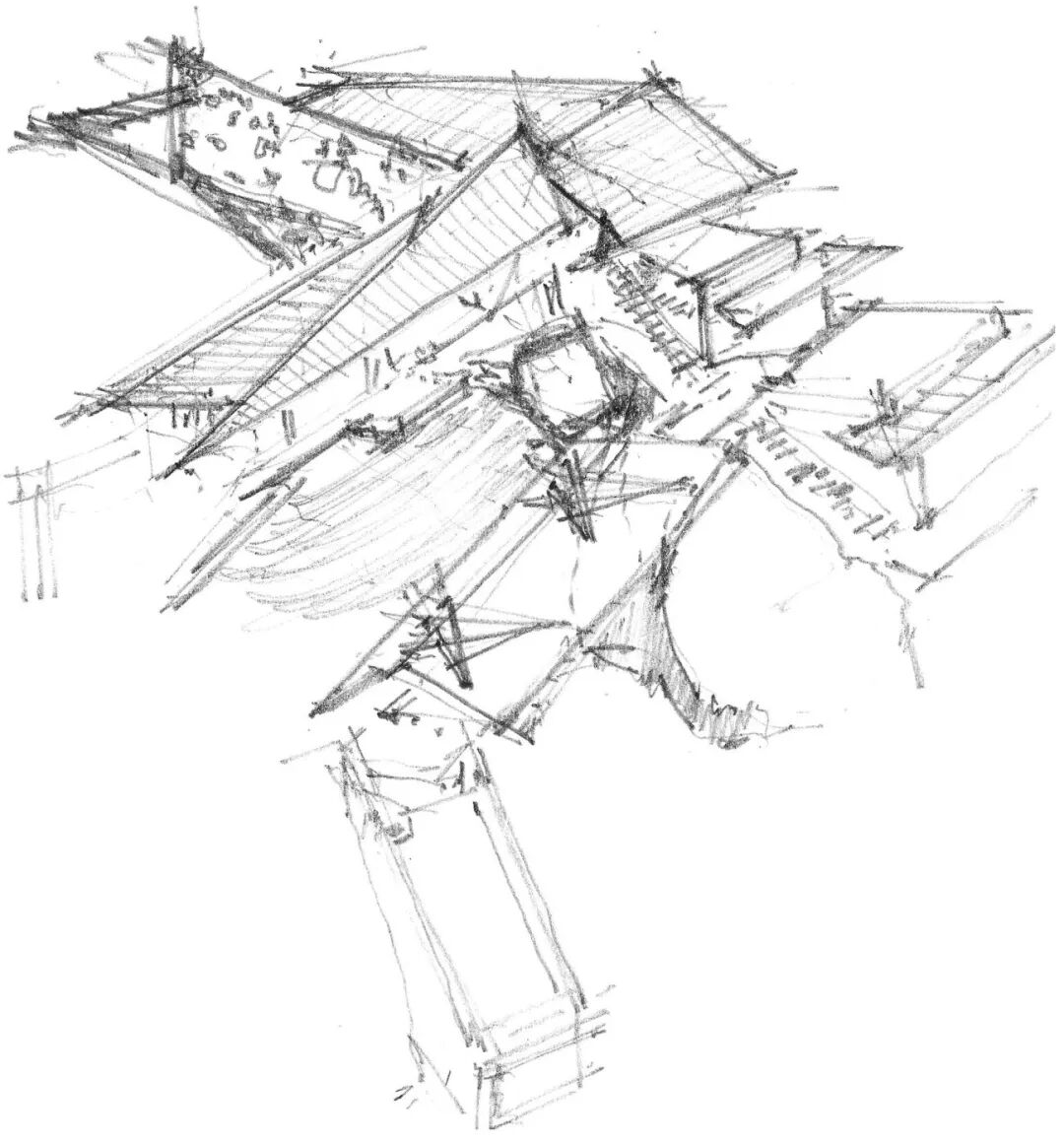 屋顶遵循高地的地形,沿着丘陵地带排布,屋顶的风化锌和当地开采的玄武岩是使用的主要可见材料。利用树状的结构来支撑屋顶。