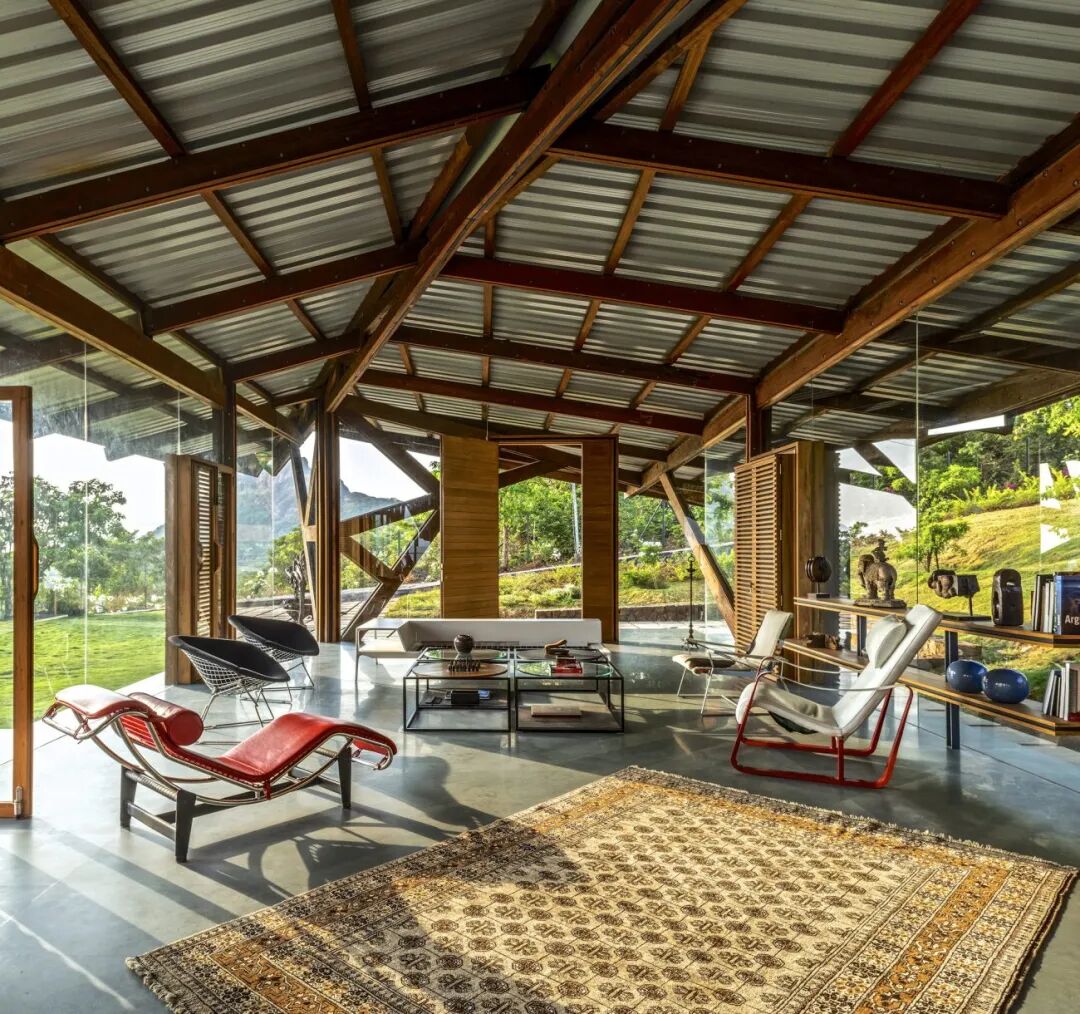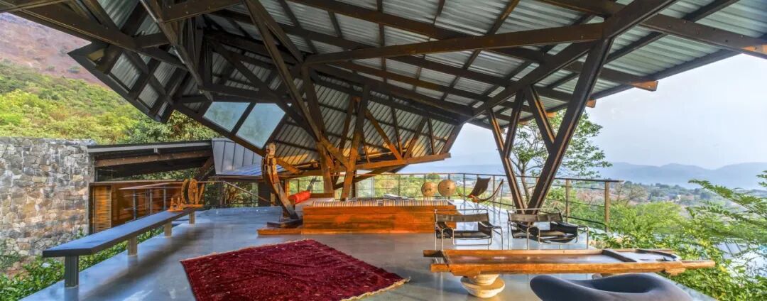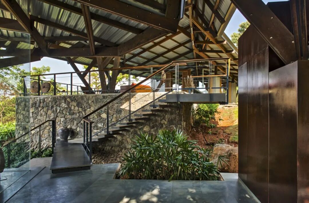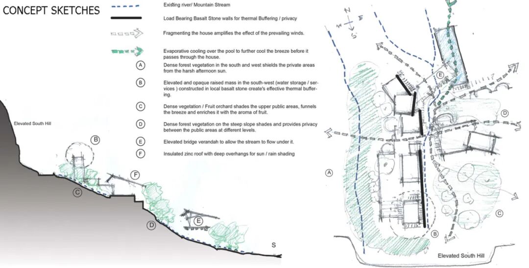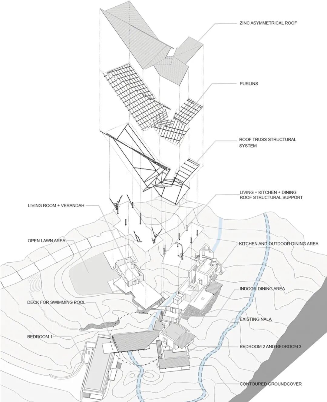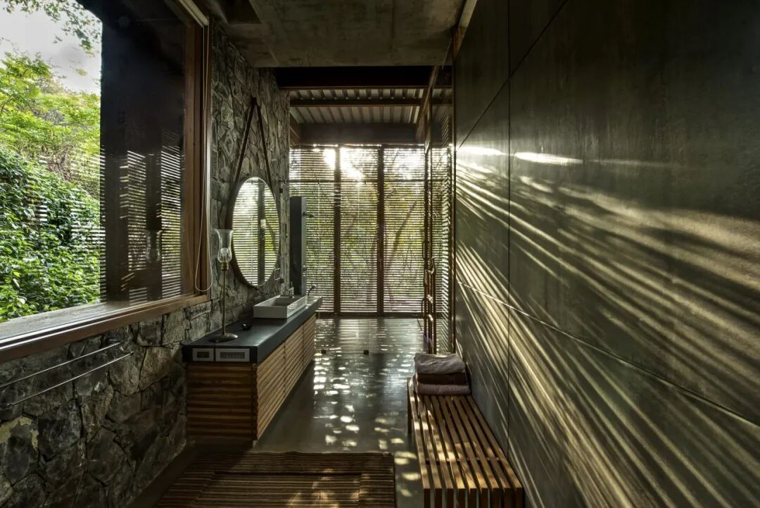 房子的一部分建在两条这样的溪流之间的山脊上,以最大限度地发挥其冷却潜力,其中一条主要的游廊像桥一样漂浮在溪流上。这也放大了穿过房子的气流。北面和东面的公共区域(该区域的理想方向)是深屋顶悬垂镂空的走廊,可防止阳光直射和雨水,但微风和景观都可以观赏到。