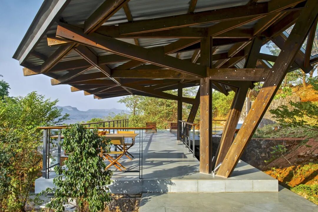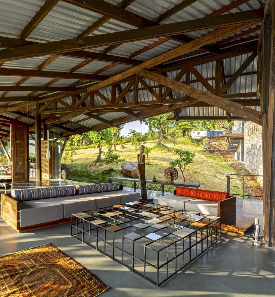 Parts of the house are built on a ridge between 2 such streams to maximise their cooling potential and one of the major Verandah floats over the stream like a bridge. This also amplifies the flow of wind through the house. The public areas towards the north and east (desirable orientations in this region) are porous verandahs with deep roof overhangs providing protection from direct sun and rain, but allowing continuous movement of the breeze and landscape/ treesd.