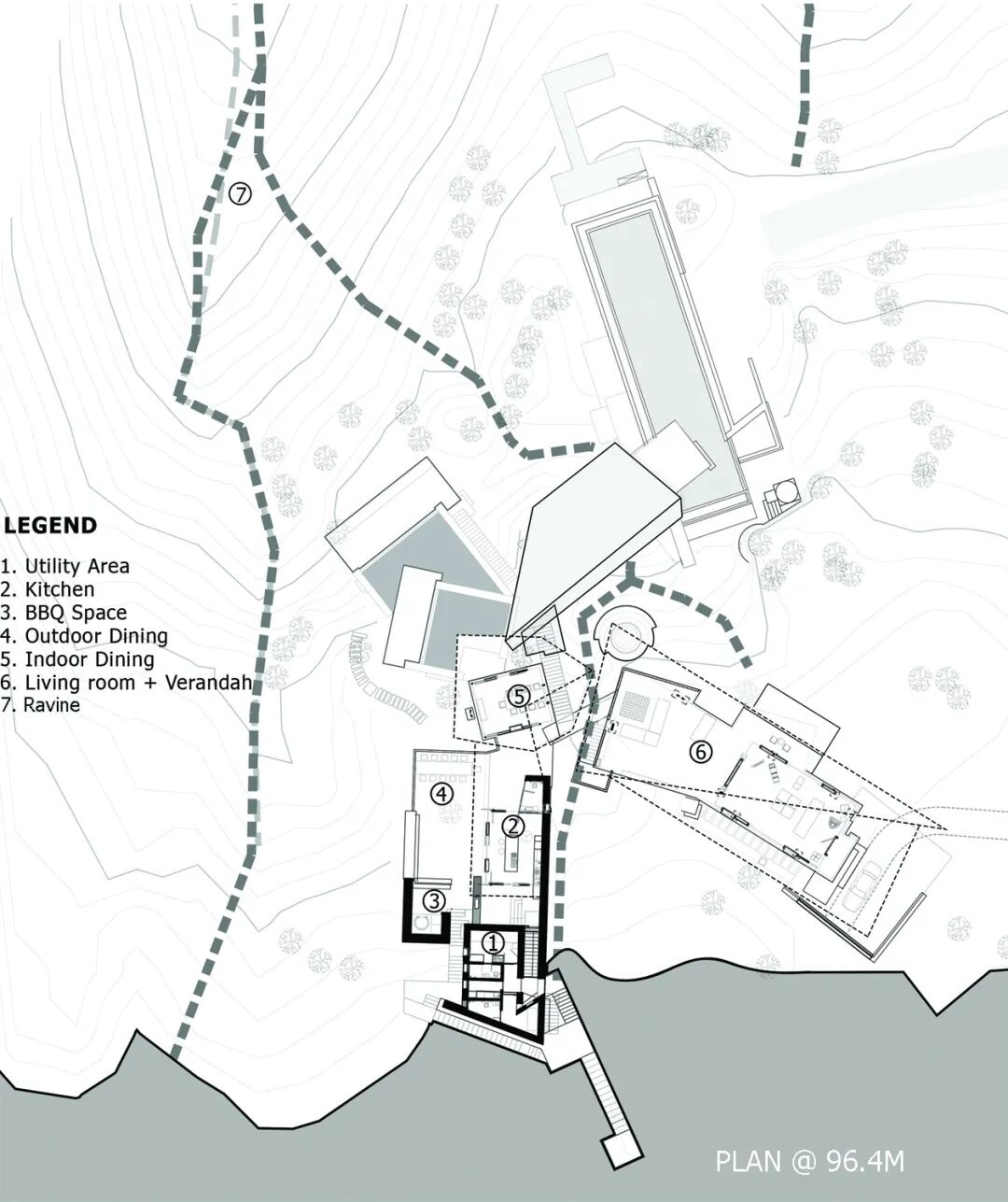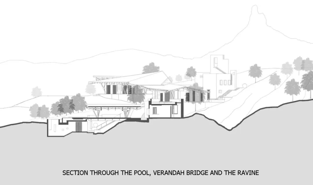 私人区域位于主山脊的南侧,俯瞰着大峡谷/季风溪流。沿着山脊从南向北延伸的一堵大石墙将这些空间连接起来,但同时又打开,使东西方向的微风和景观相互渗透。西面茂密的森林遮蔽了这些空间,而西南角则高出地面,为房子遮挡午后的阳光。泳池下方的两间卧室可确保自然降温,泳池沿房屋轴线的方向可使微风在穿过房子之前冷却下来。泳池的高度也可以减少在温暖/干燥的夏季出现老鼠/青蛙/蛇的可能性。