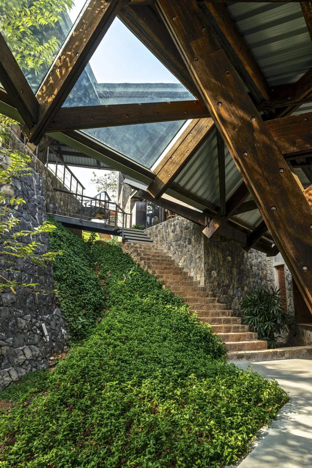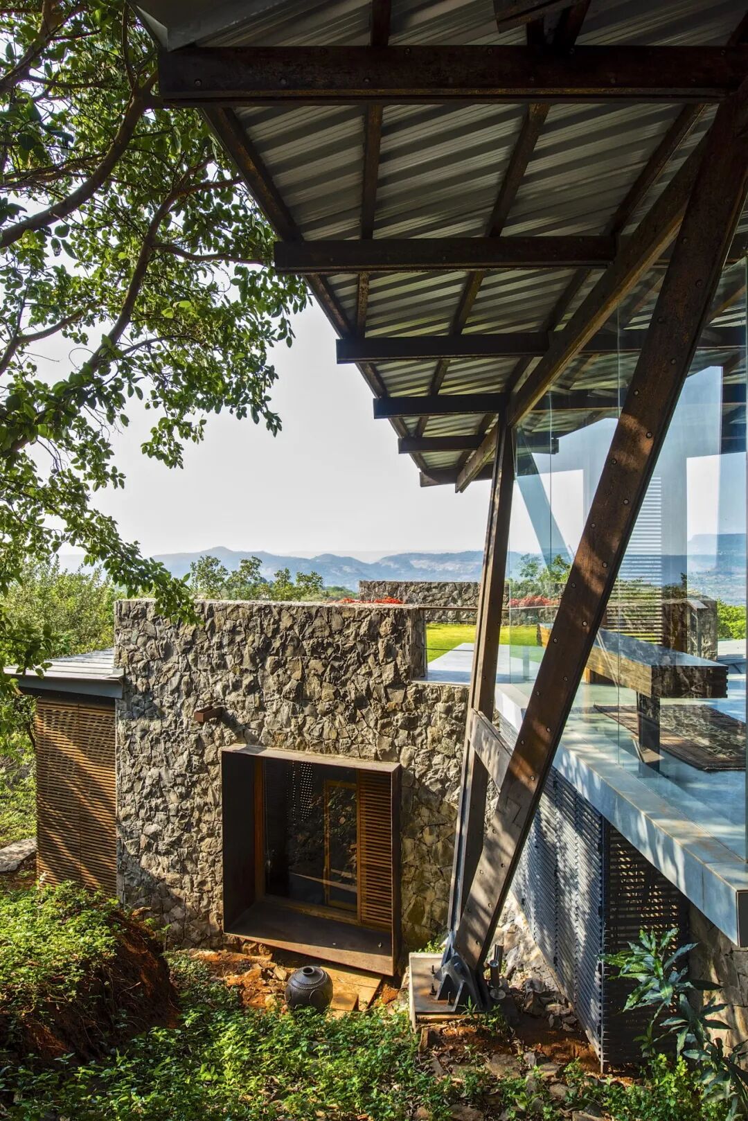 作为四代人的家园,它就像一个浓缩的村庄,包含着独居和群居的生活空间。大型承重墙建造在两个峡谷之间,将房子固定住,与当地的防御工事Tungi和Lohgad堡垒的墙体轮廓和材质一样。