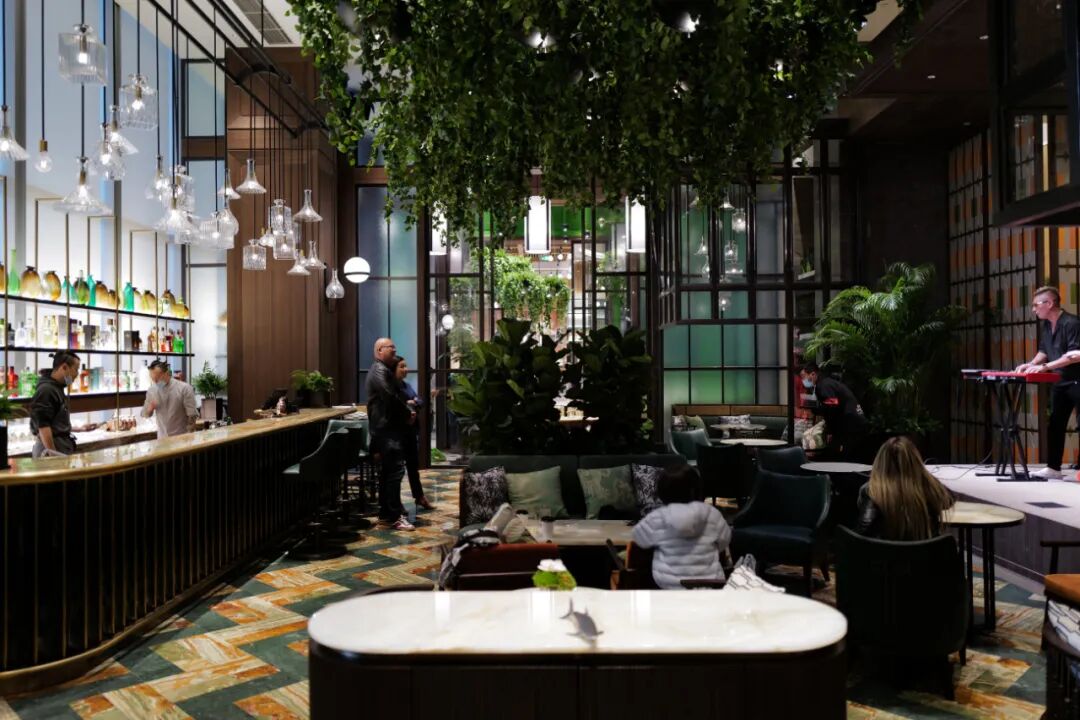 与大堂同处底楼的全日制餐厅、酒吧、火锅餐厅,也尽量模糊了彼此及与大堂的界限,并尽量与街道贯穿,并大篇幅融入绿植,尤其是从天而降的垂挂式绿植,让人如同身处华盖之下,心旷神怡。新一代香格里拉对社区、户外和绿色的友好度呼之欲出。