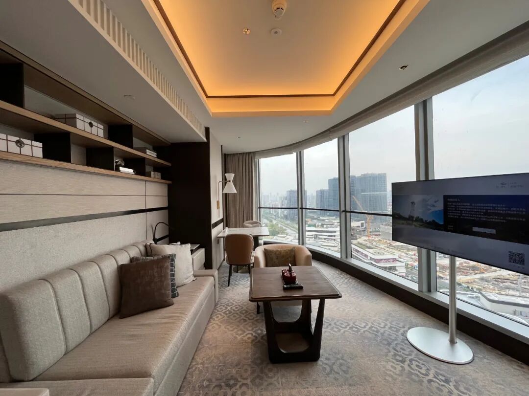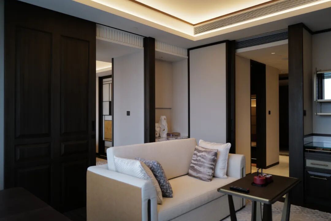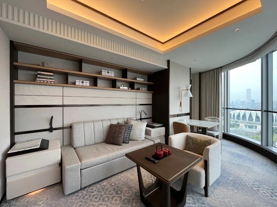 套房根据所处方位,拥有或方正、或被曲面落地窗围拢的起居室,层次舒缓的空间递进和周全的配置,让房内聚会、工作、休憩、用餐都很从容流畅。