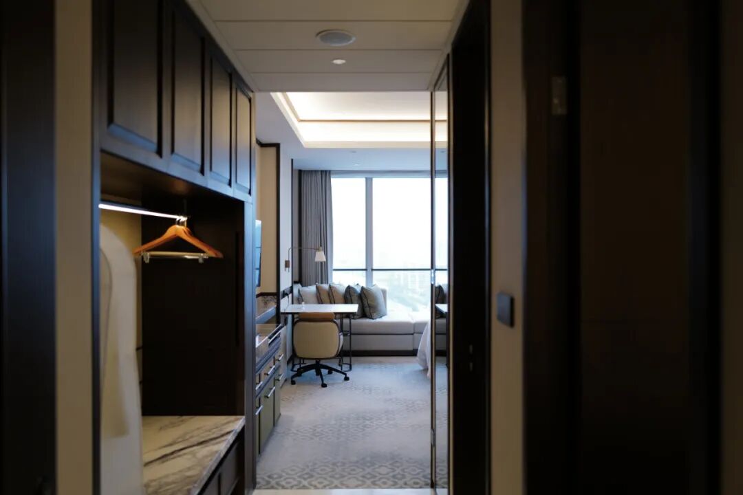 前滩香格里拉的北向(面黄浦江和前滩太古里)和南向(面楼群)客房有着截然不同的风格和格局。北向客房构造略简洁轻盈,入户走廊伴随着开放式衣帽柜,临窗位置安有多用途桌面和随落地窗一字型延展的长榻,让人以最舒心优雅的姿态,俯瞰名店云集的前滩太古里建筑群和蜿蜒而过的浦江,同时也能灵活作为会客榻或加床。