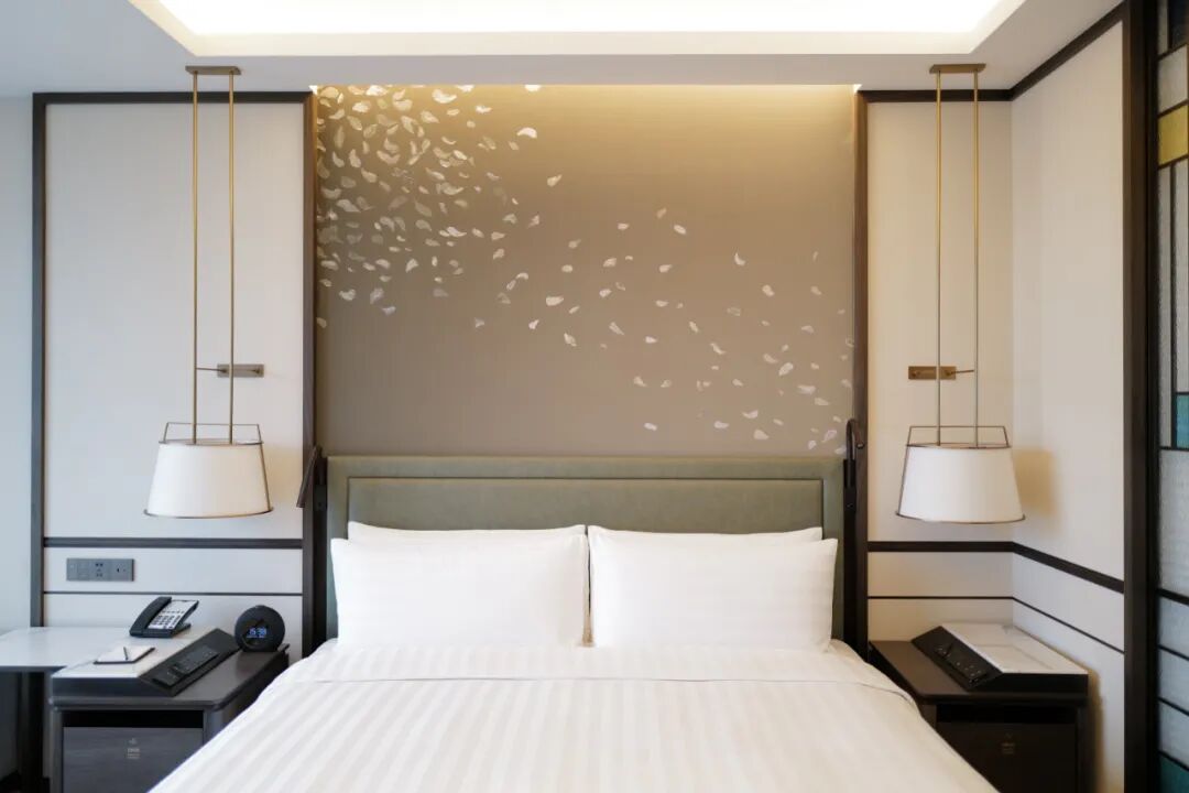 南向客房的格调略显古雅,借助床背板、地毯织物、屏风门融入了石库门等老上海居住元素,更具复古感。这款客房的临窗空间可通过展开抽拉门,形成一间独立的起居室或第二间卧室(沙发可变身睡床)。