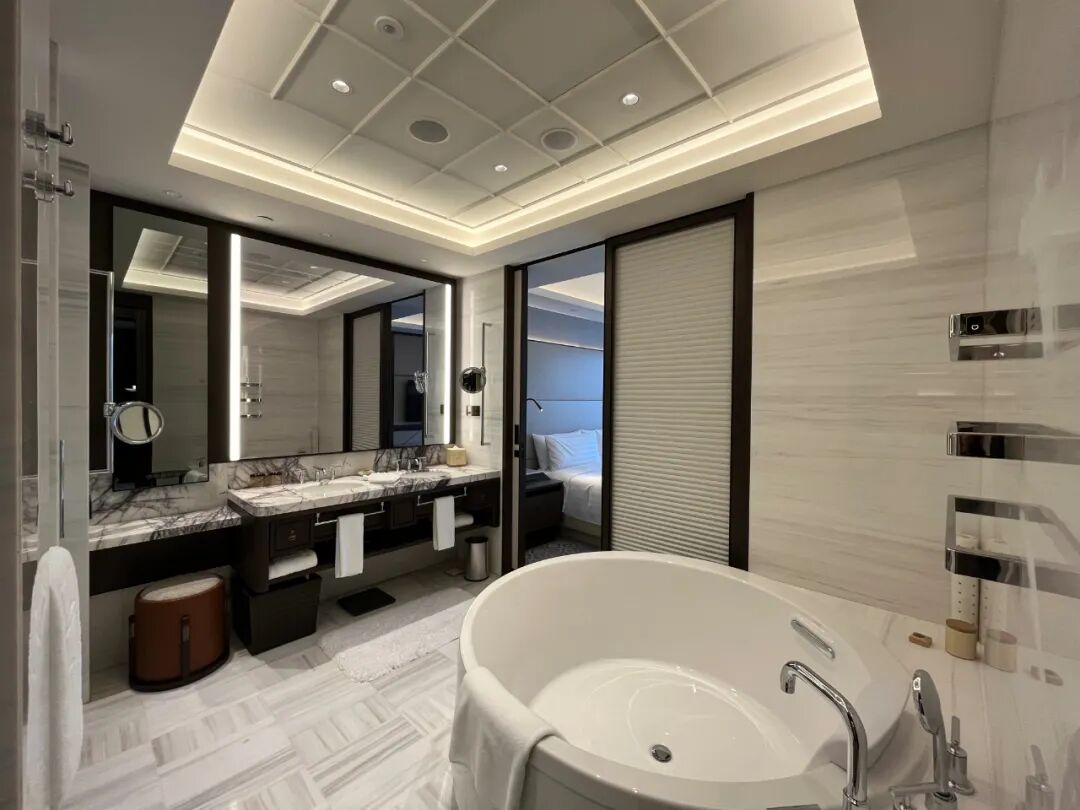 浴室以柔和清丽的纯白大理石为基调,融入镜面时钟、智能座厕、加热毛巾架。双床房把浴室分割成两个空间相当的独立隔间(下图),让分享客房的人士可以拥有彼此独用的洗漱台,提高了效率和私密性。