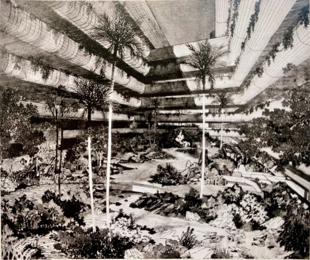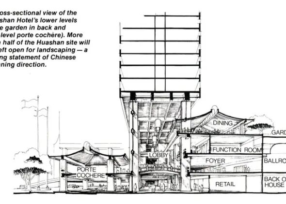 WATG的主创最终于1978年(中美建交前一年)来到中国,进行考察、创作和汇报,最终完成了一个充满了摩登都市感的摩天楼酒店方案——楼高38层、客房数1250间,两层高的落客亭阁和挑空6层的大堂气势磅礴,令中式气韵和现代酒店风貌的流畅交融。并结合当时中国国情,设计了相当体量的现场员工居住区和自行车库。