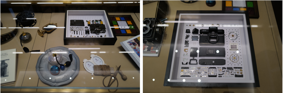 门厅两侧分别是接待前台和图书馆。图书馆有着博物馆式的玻璃陈列台和让宾客在入住、退房需要等候或与人快速会面时,可以透过海鸥相机、古董香水瓶、老房子上拆下的拼花玻璃等老物件,读取上海城市的往昔记忆。