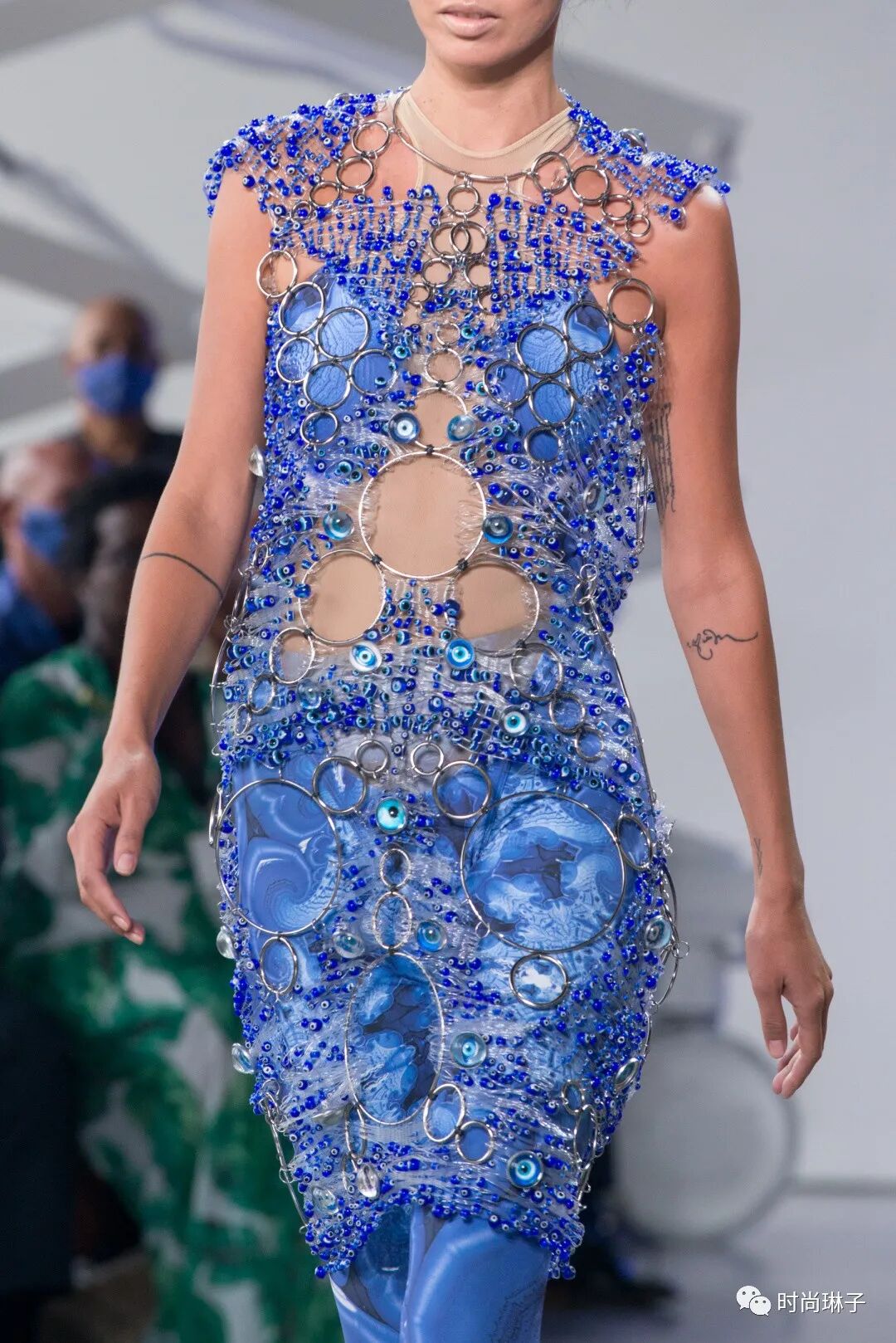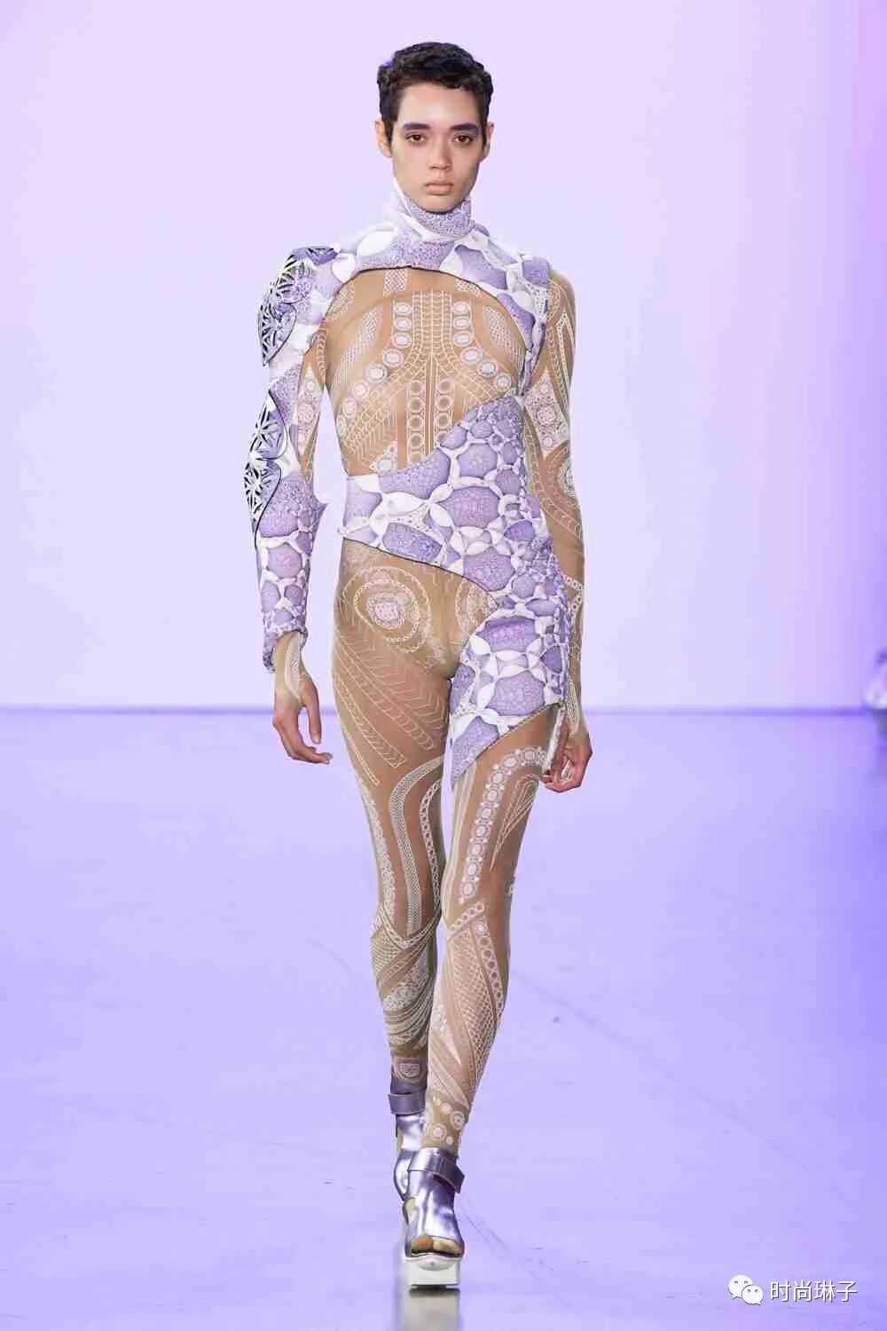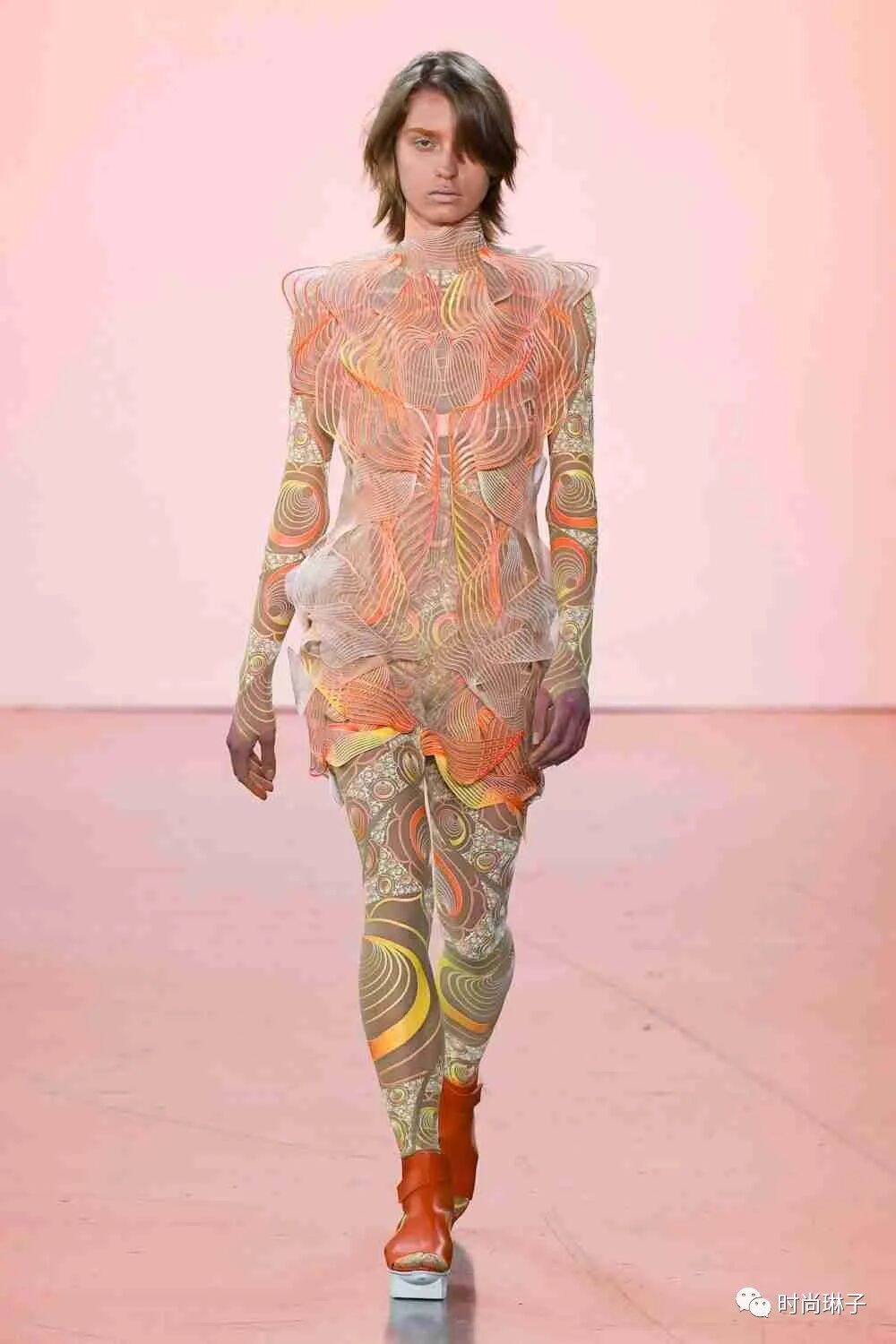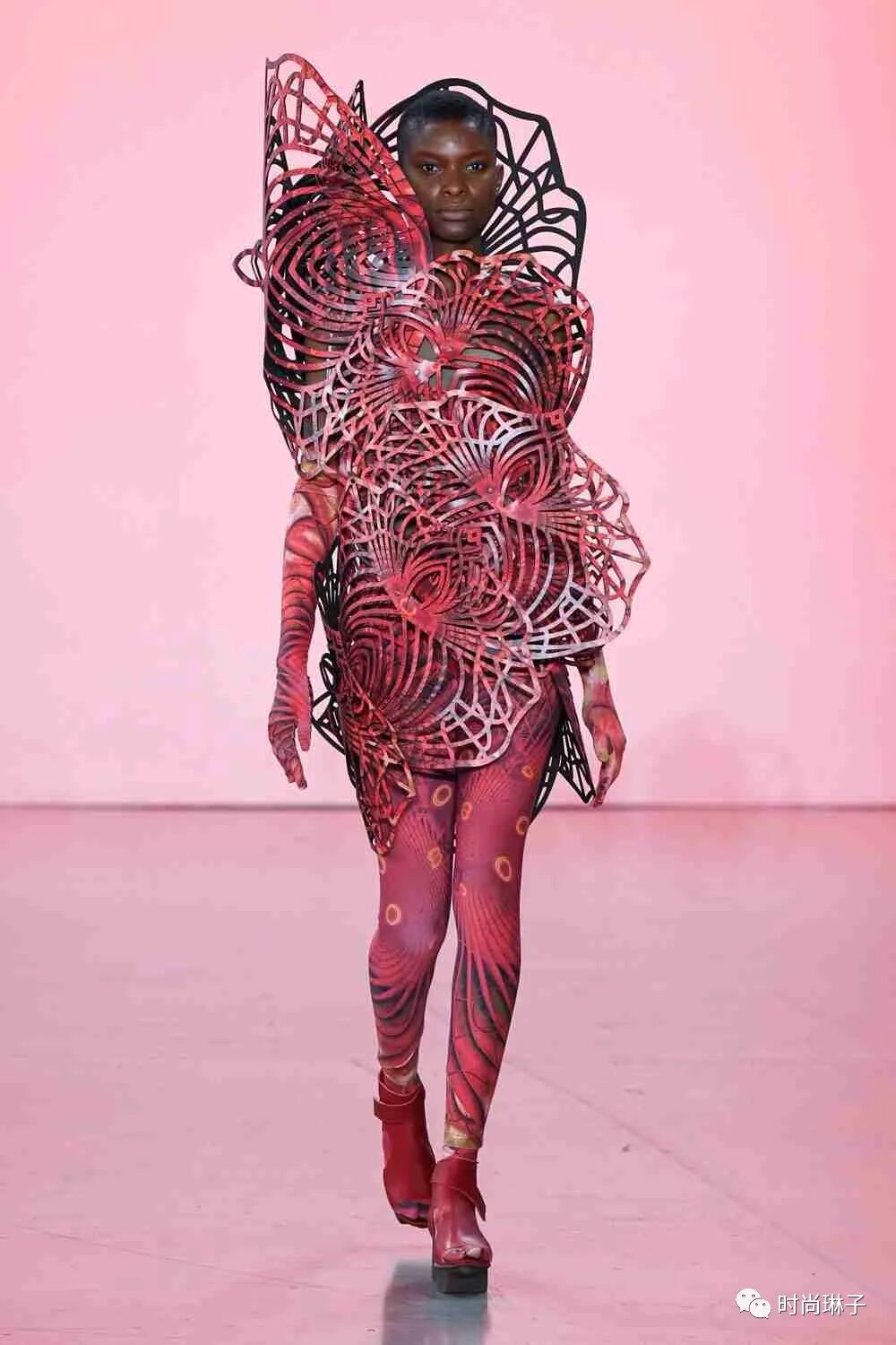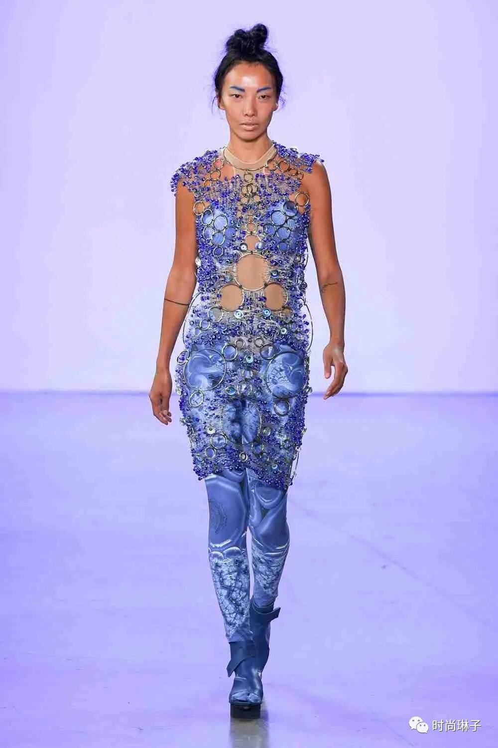 系列中的激光切割连衣裙融合了建筑和盔甲的元素,折纸褶皱缎带连衣裙,以及串珠编织连衣裙,搭配紧身裤,时尚且前卫。
