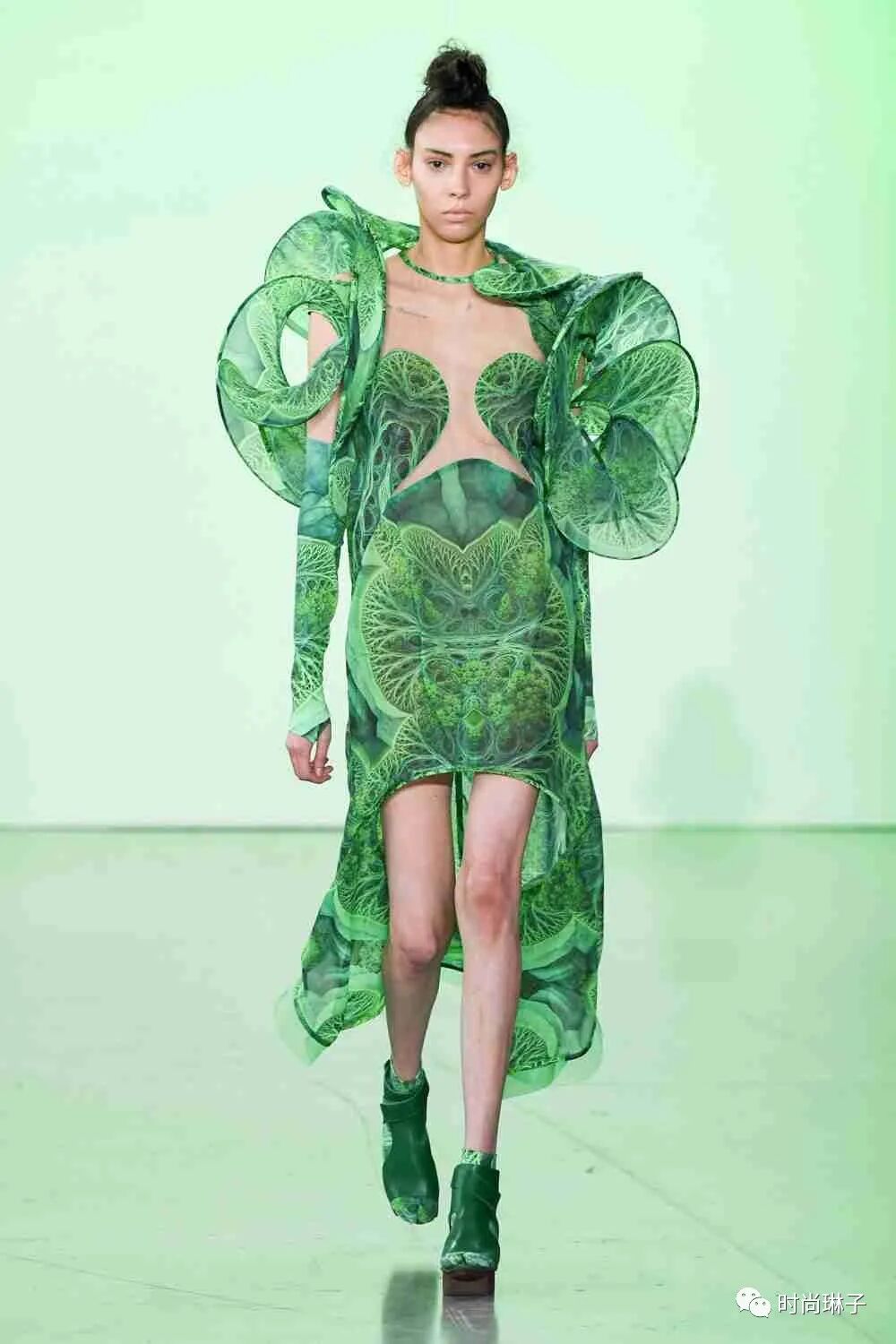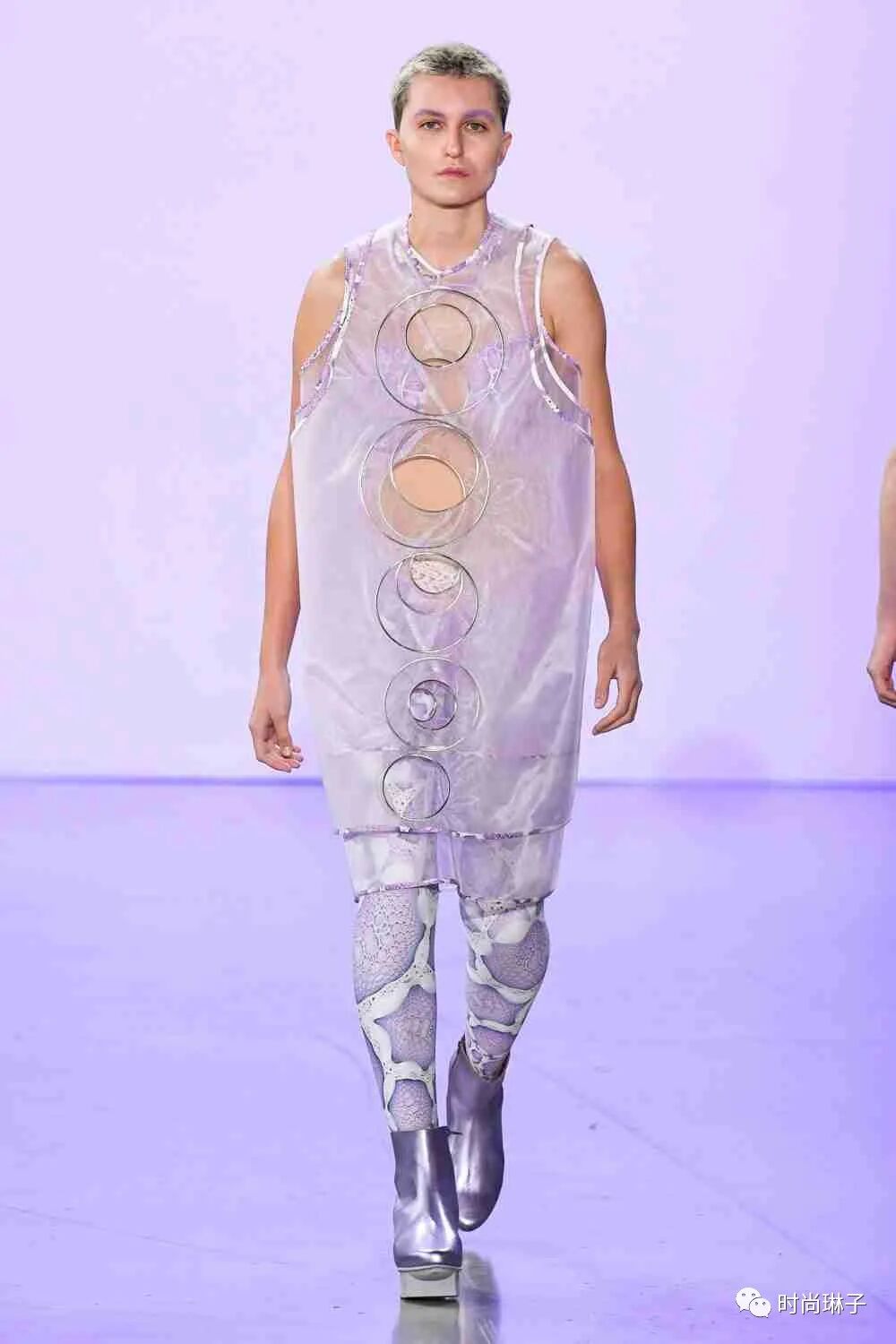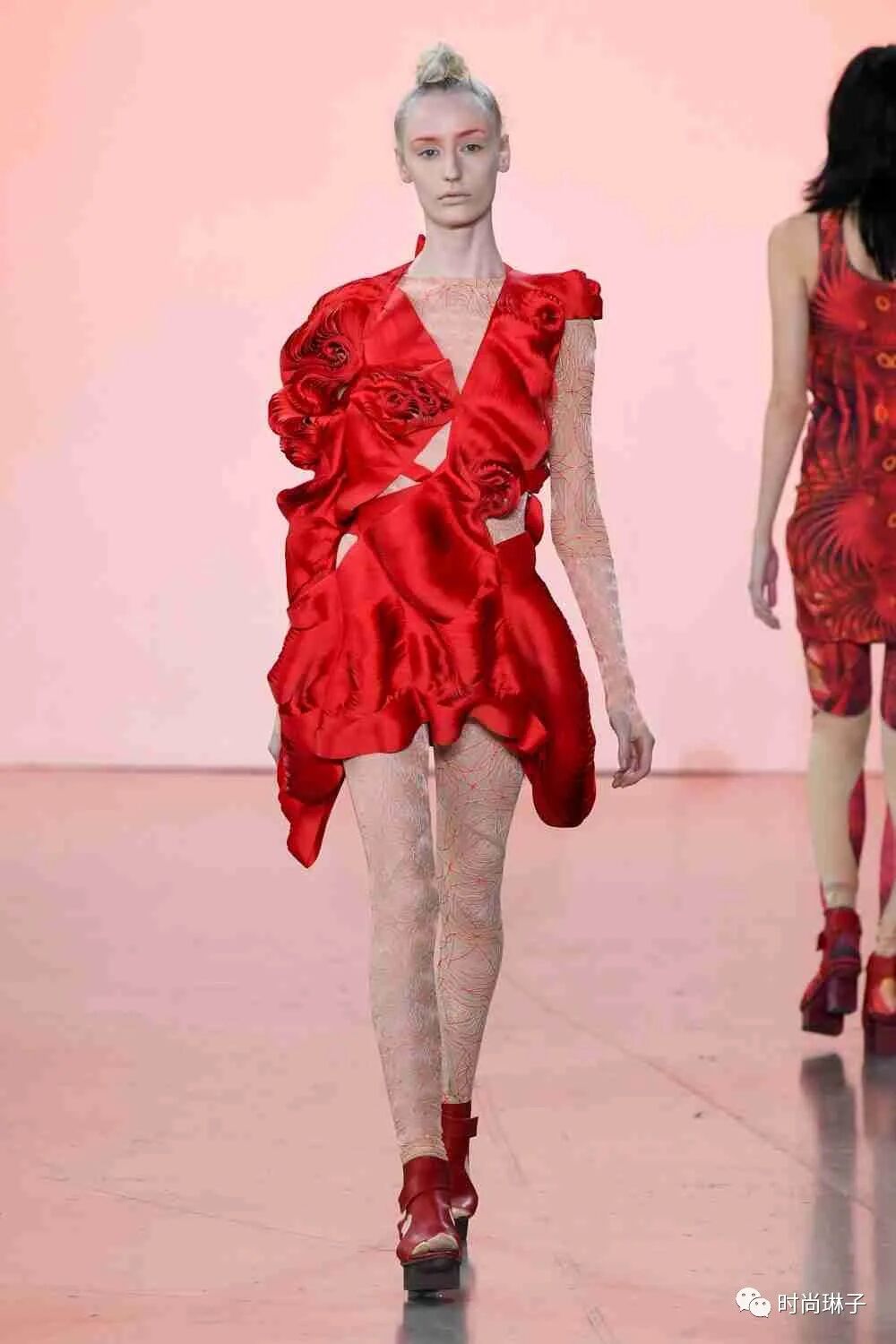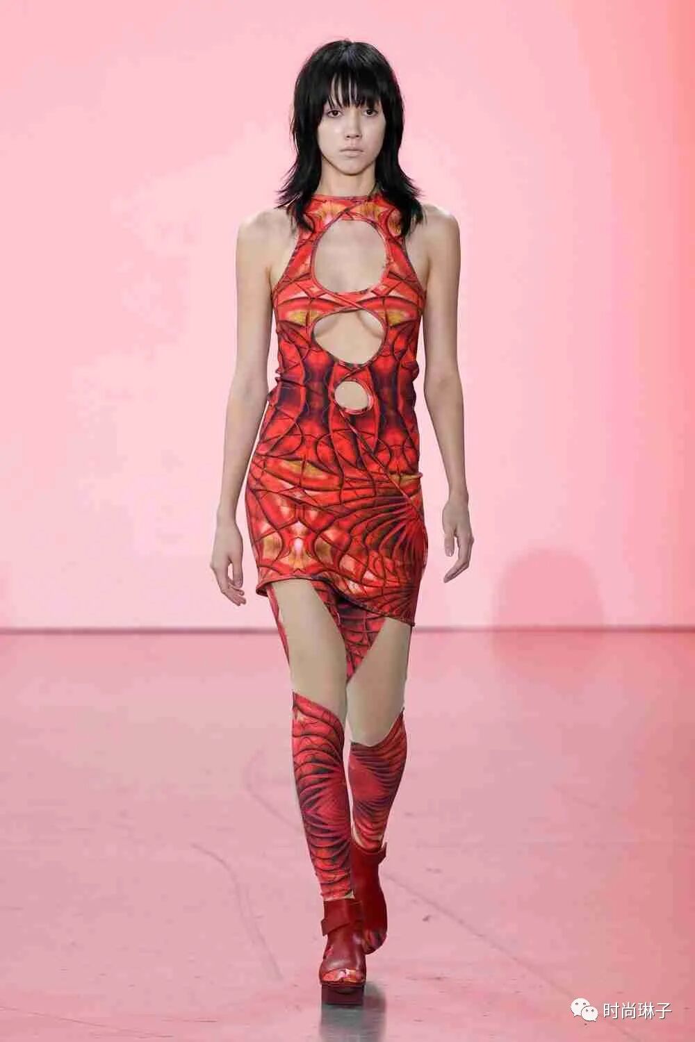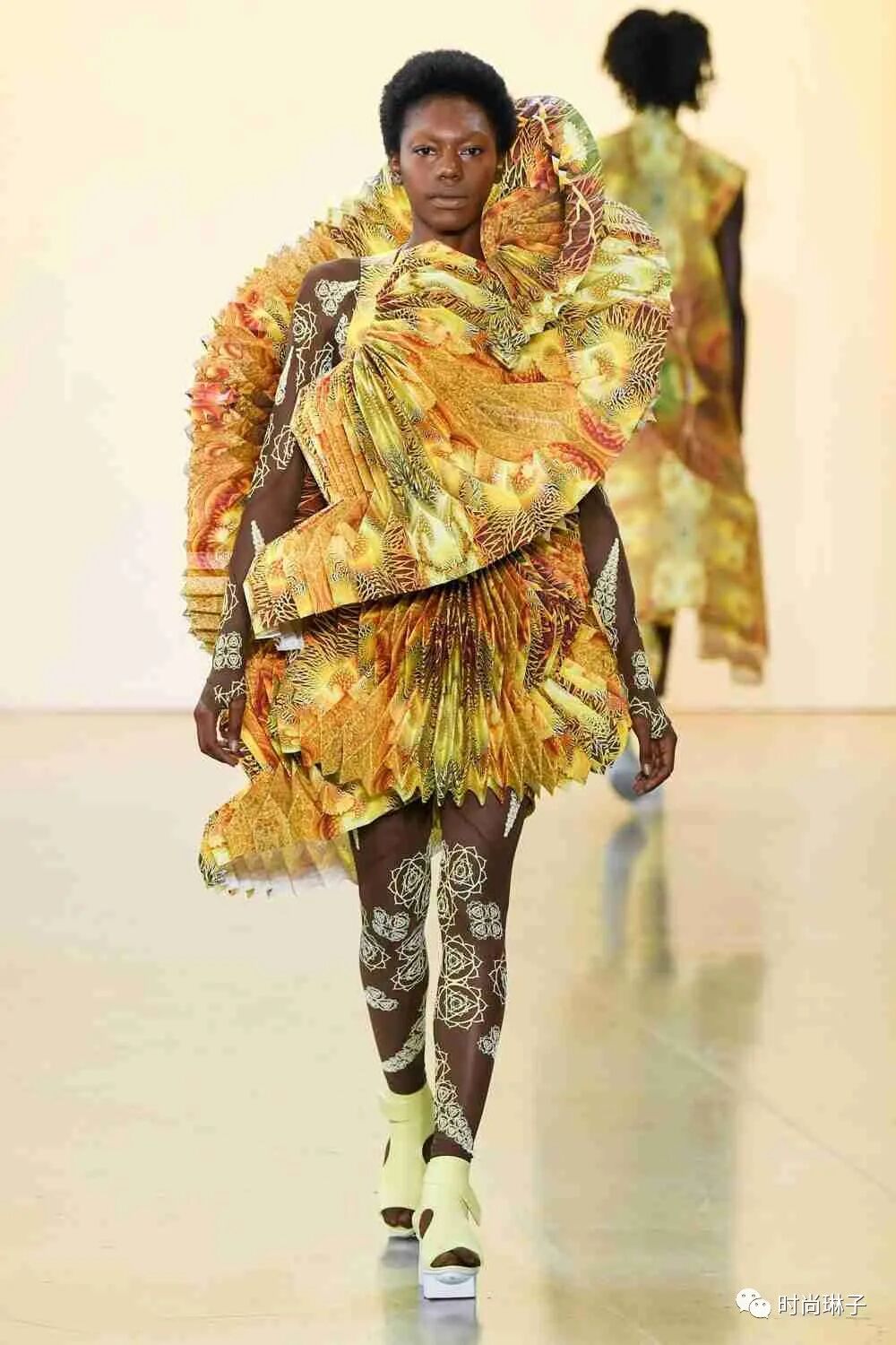 系列中的激光切割连衣裙融合了建筑和盔甲的元素,折纸褶皱缎带连衣裙,以及串珠编织连衣裙,搭配紧身裤,时尚且前卫。