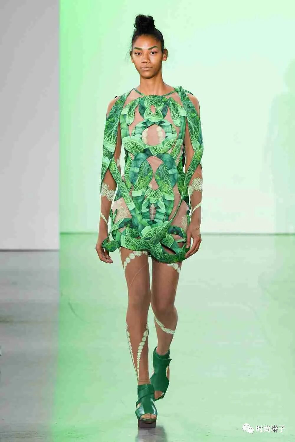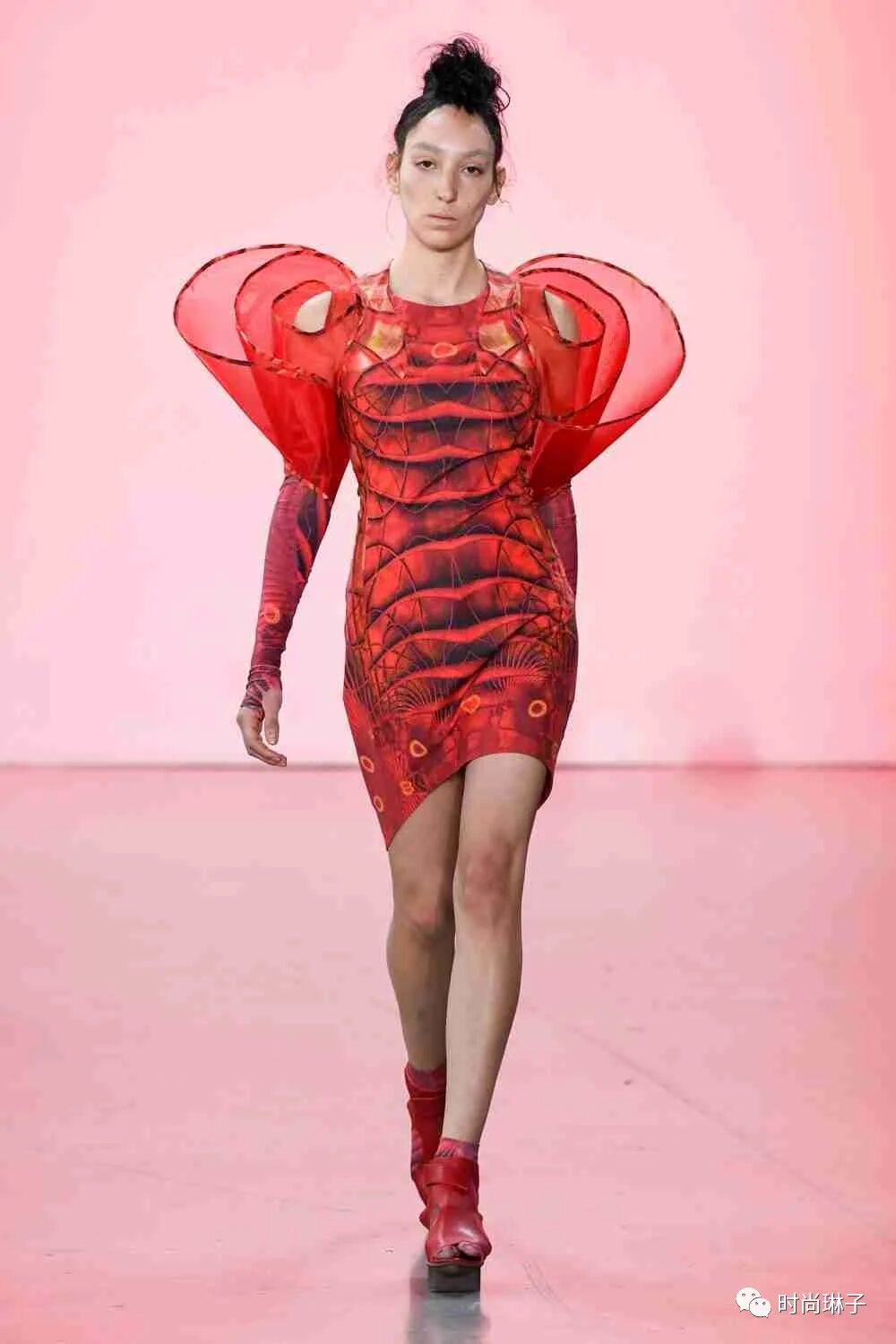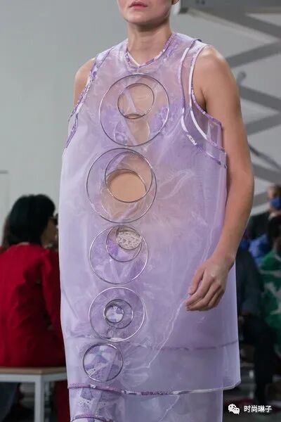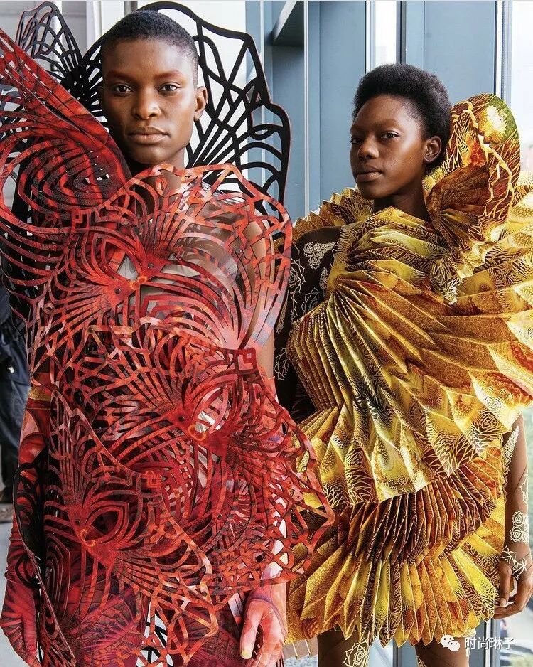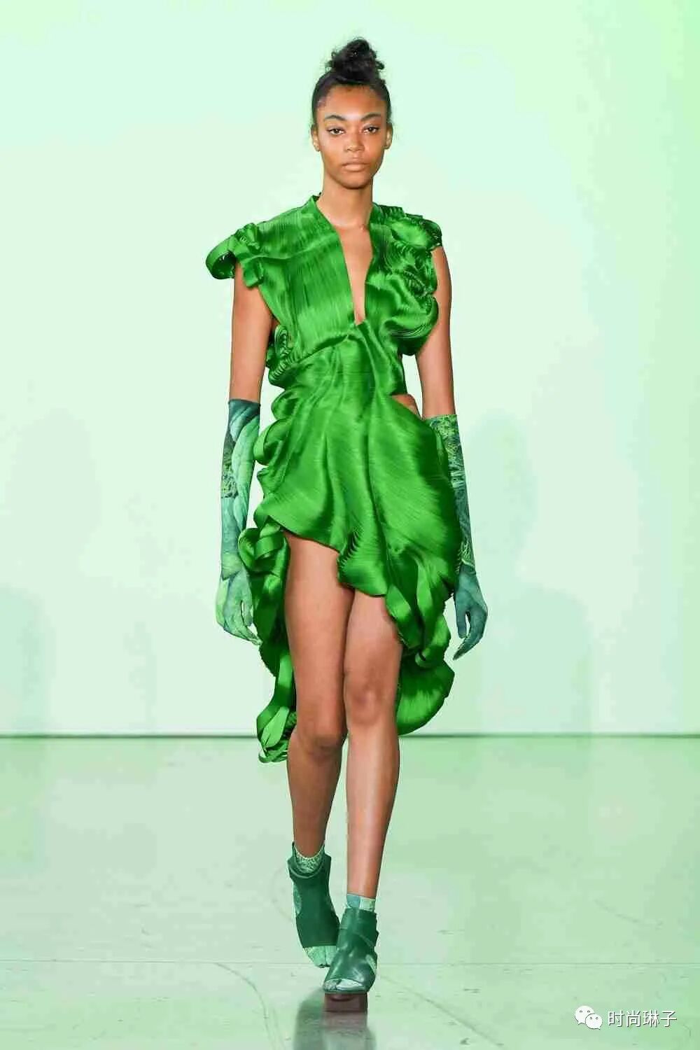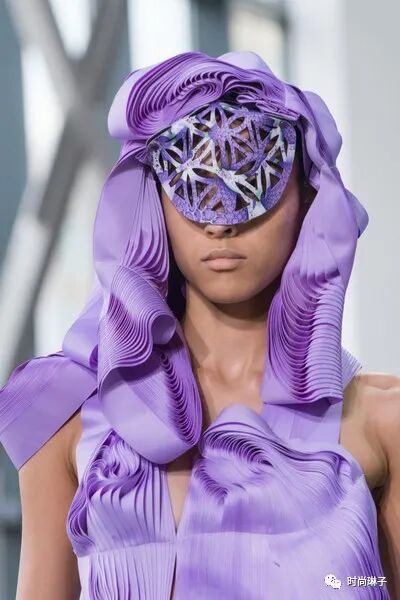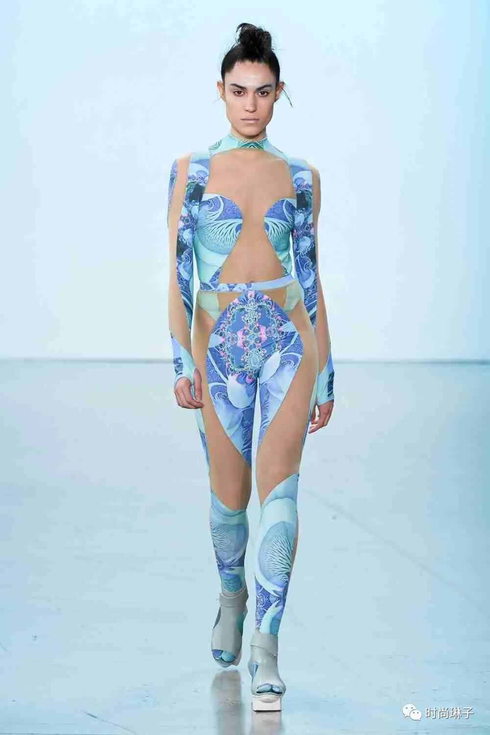 系列中的激光切割连衣裙融合了建筑和盔甲的元素,折纸褶皱缎带连衣裙,以及串珠编织连衣裙,搭配紧身裤,时尚且前卫。