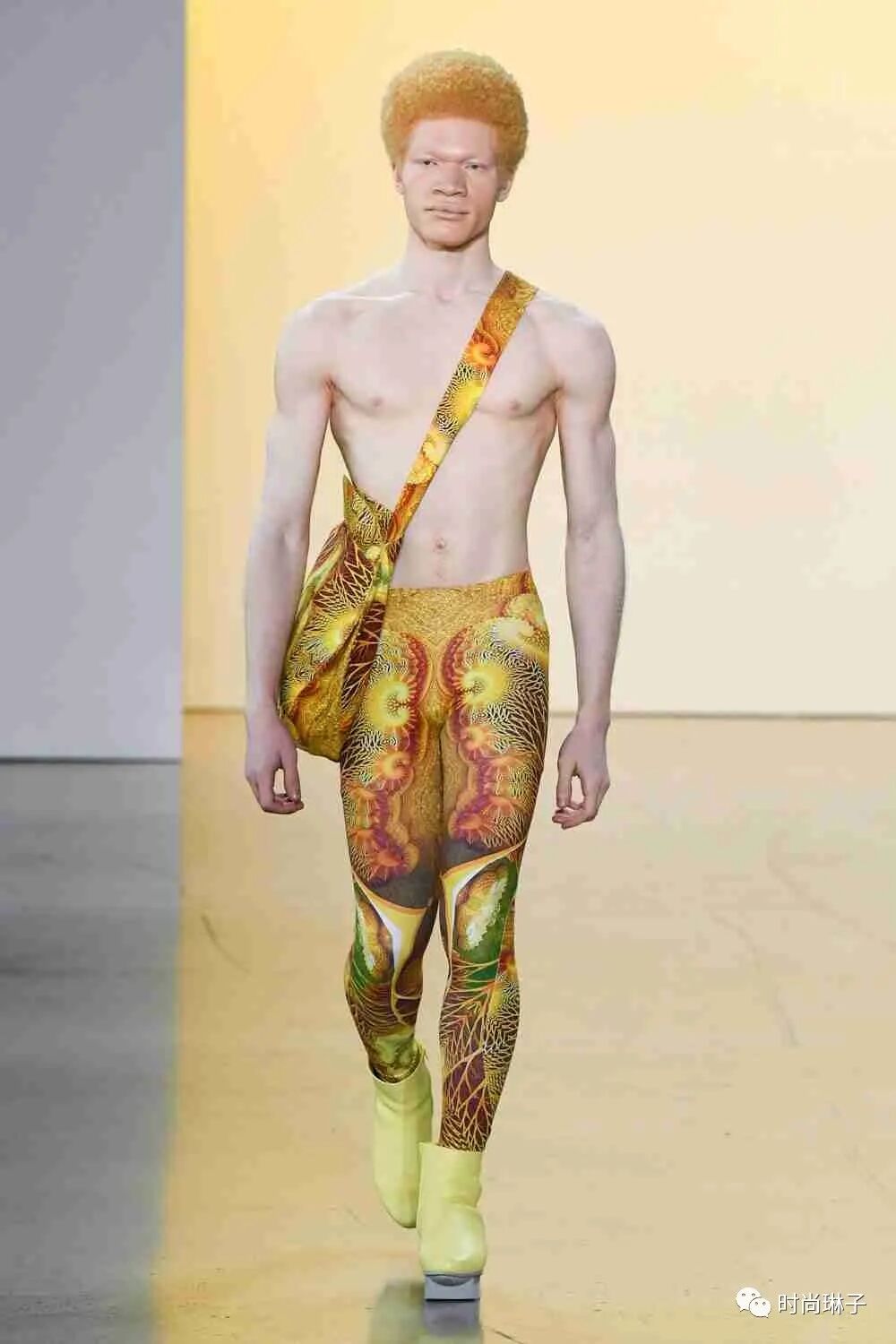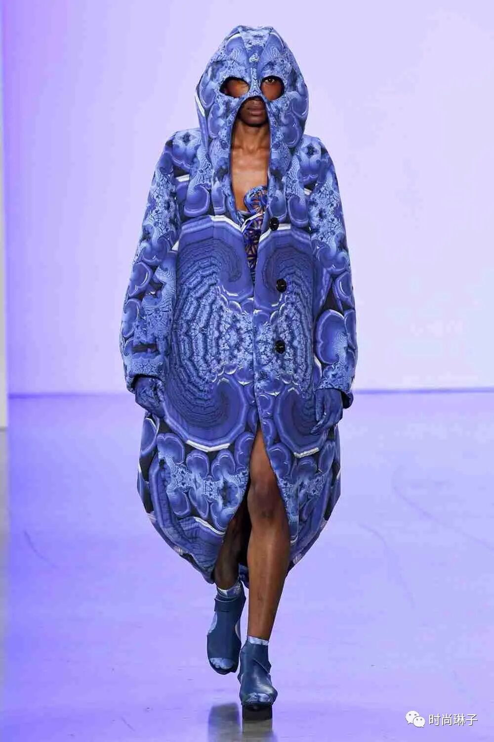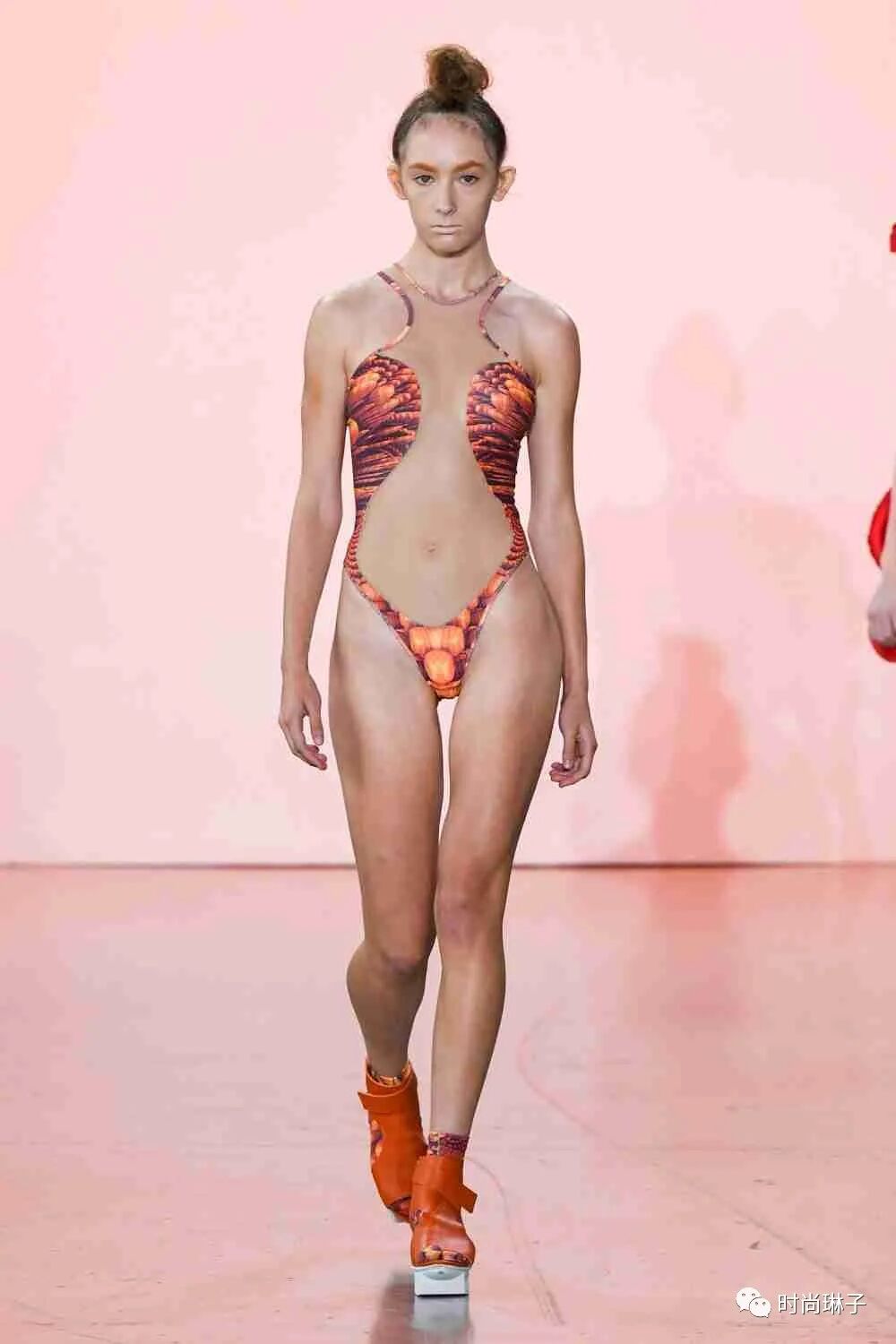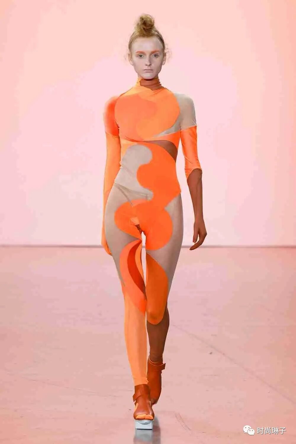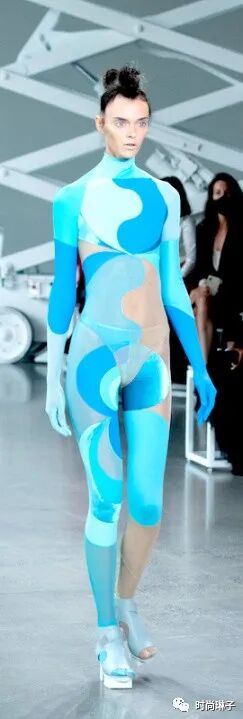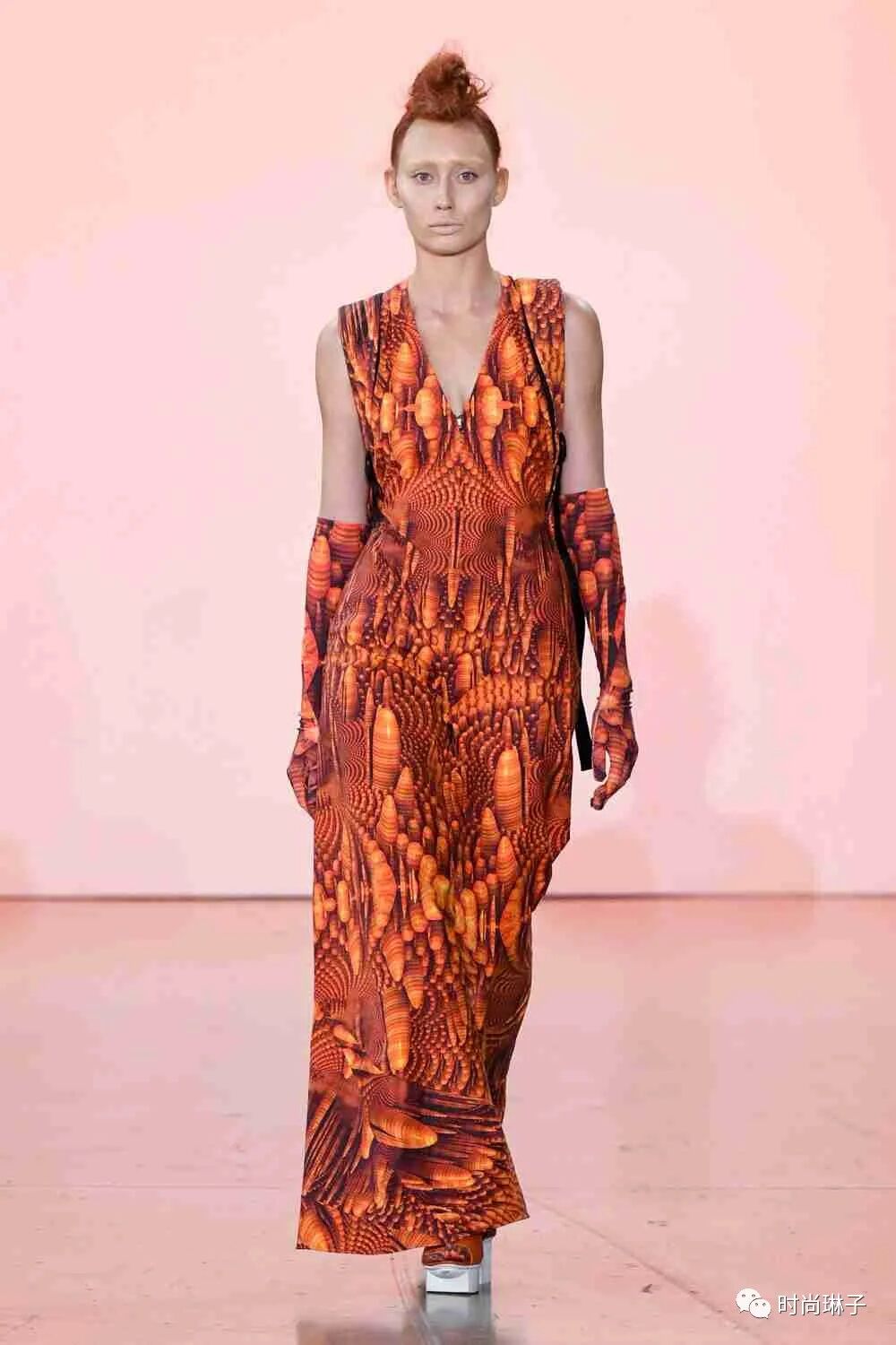 系列中的激光切割连衣裙融合了建筑和盔甲的元素,折纸褶皱缎带连衣裙,以及串珠编织连衣裙,搭配紧身裤,时尚且前卫。