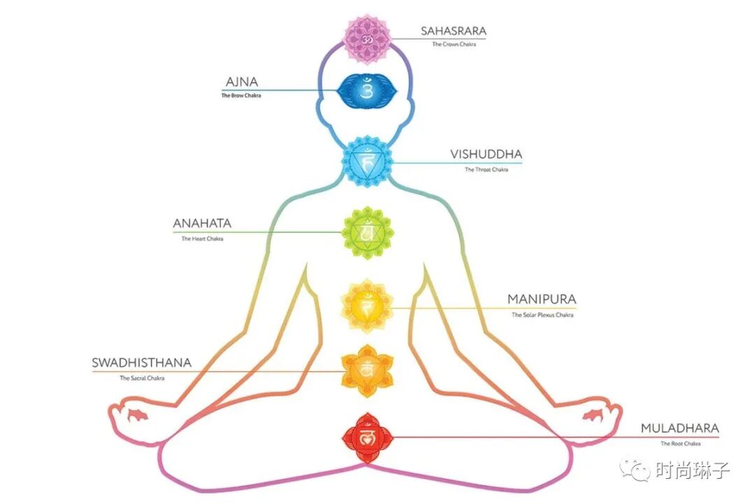 脉轮在印度瑜伽的概念中是指分布于人体各部位的能量中枢。人体共有七大脉轮,以直线垂直分布,位于脊柱附近,从下至上分别为根轮、腹轮、脐轮、心轮、喉轮、额轮、顶轮,分别发出“红、橙、黄、绿、蓝、靛、紫”七种彩色光,它们正好对应身体七个主要内分泌腺体和神经丛,负责维持特定器官的能量健康。