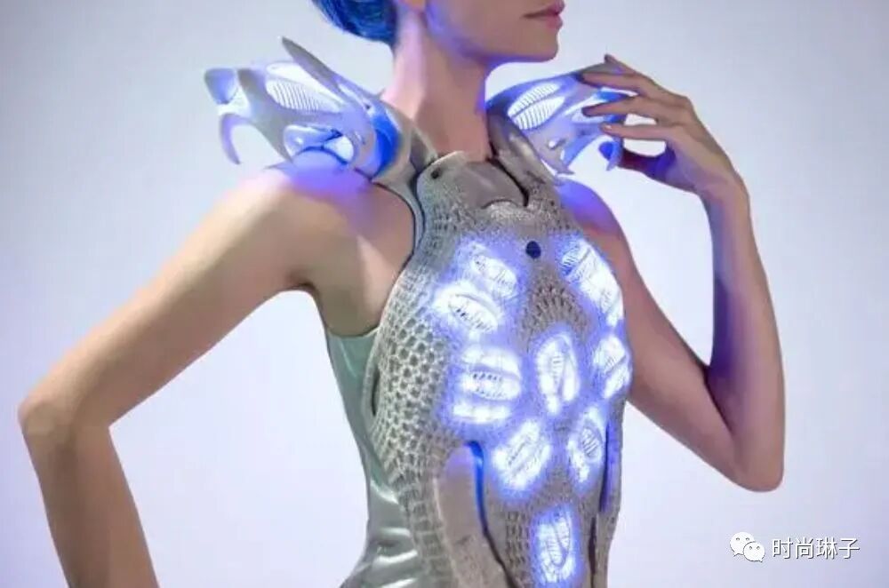 除了ThreeAsFour的设计师,会让人想到另一位荷兰高科技时尚设计师Anouk Wipprecht,她通过3D打印和高科技创作出的“蜘蛛裙“,由英特尔提供技术支持,内置可以监测穿着者呼吸的传感器和距离感应器,如果有人主动快速接近穿着者,传感器会读取到威胁,裙子的蜘蛛机械臂会自动收缩保护她。