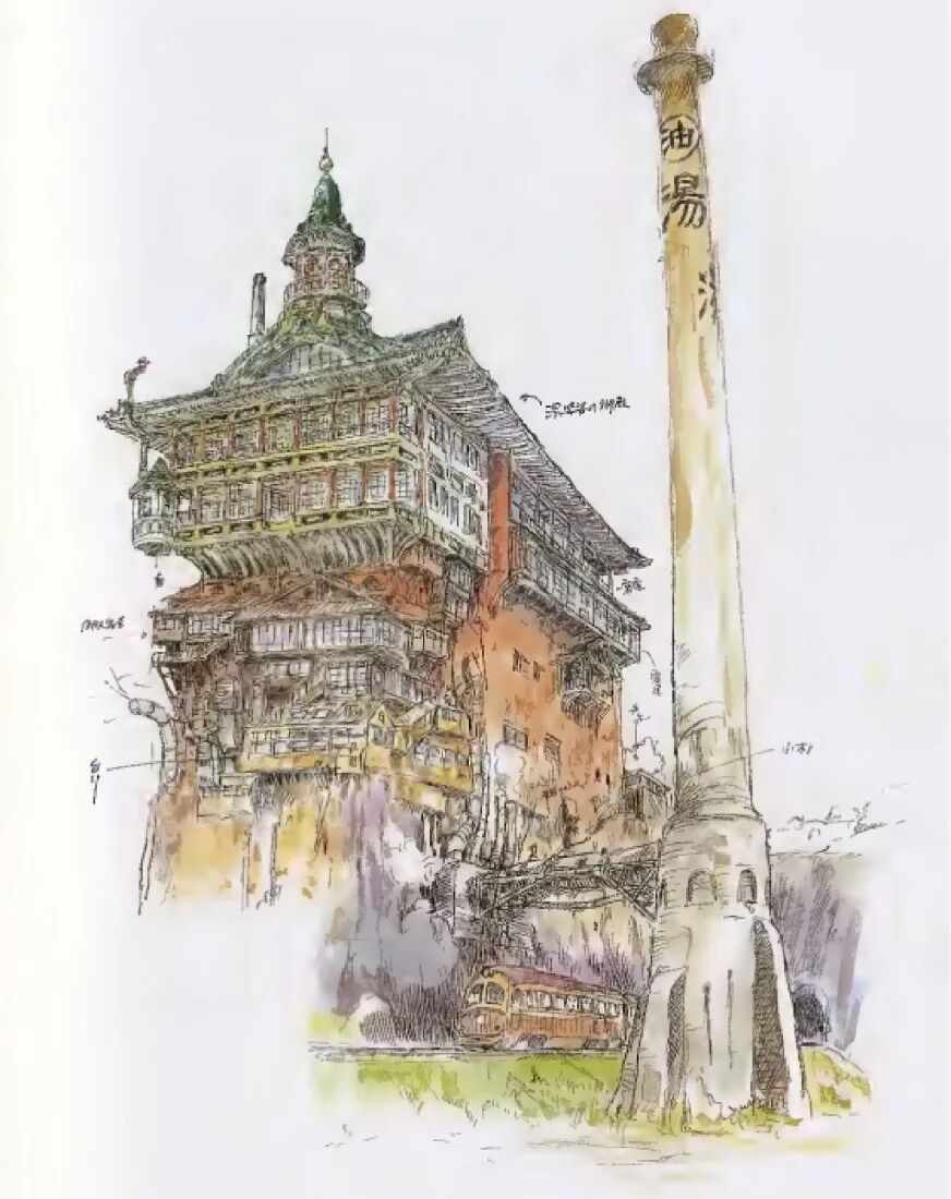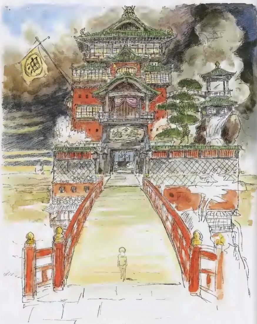 在电影《千与千寻》中可以看到不同的建筑元素,比如他们到达精神世界的火车站,更多商业用途的村庄,主桥,以及千寻开始工作的澡堂。