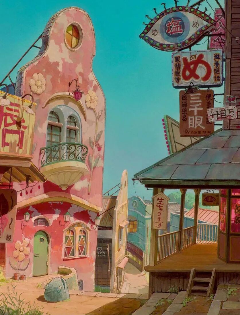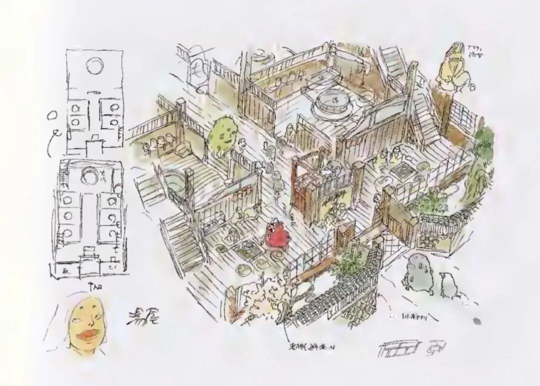 宫崎骏将他的叙事置于自然和建筑环境中,其特点是令人印象深刻的图形丰富、纹理的复杂性以及对最小细节的一丝不苟。工作室的想法基于真实的事物和环境,但具有梦幻般的皮肤。梁和柱结合了幻想结合现实,使结构细节非常精确,具有很高的艺术和情感价值。