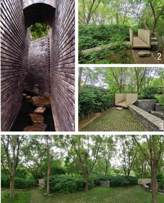 这得先从红砖美术馆说起,场地本是平地,庭园部分起伏的山林地形是掘池之土堆叠而成,起伏是随机的。这样便带来覆土下空间的阴翳美学(下图1、2、3)与高下的视野诱惑(下图4)
