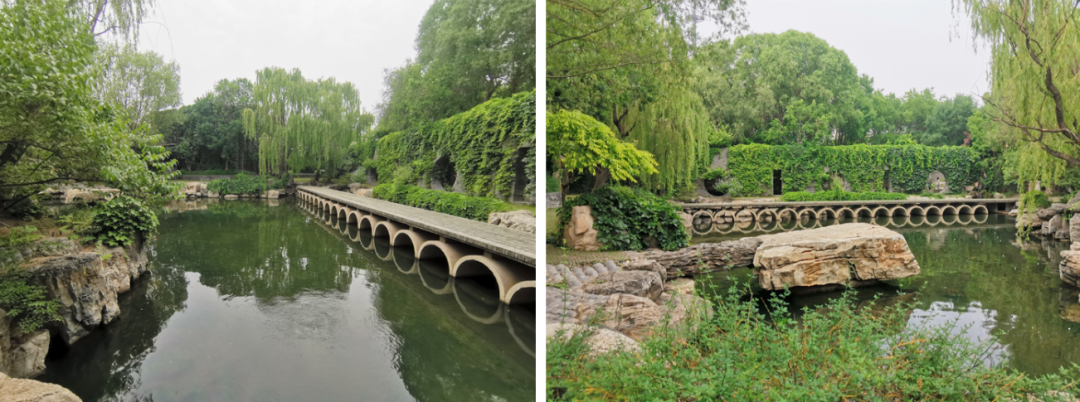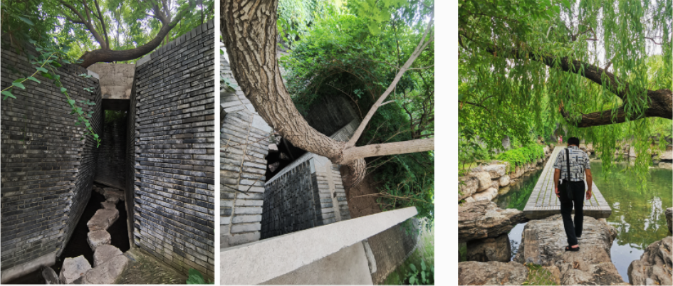 庭园部分有2颗非常有意思的树,一个是石涧出口位置,一个是十七孔桥西侧桥头,将人压入。估计多半是人故意为之。