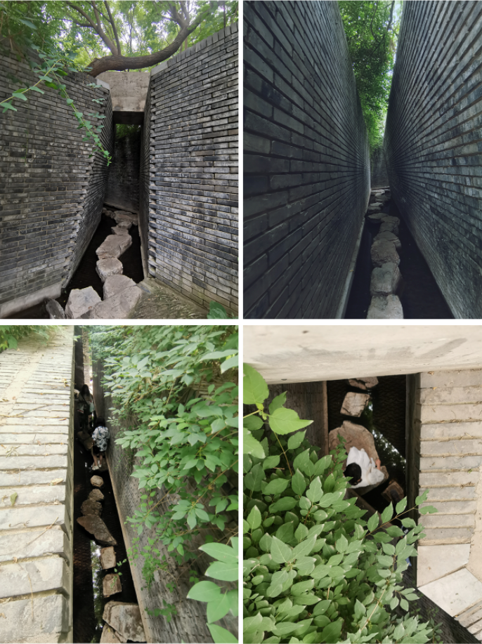 现场要比照片暗些,走在里面有光影斑驳的氛围。墙体转折衔接点的做法一是便于青砖施工,二是让墙体不会感到很笨重。