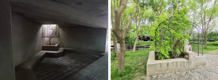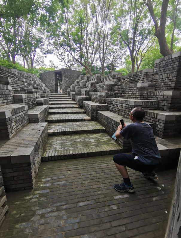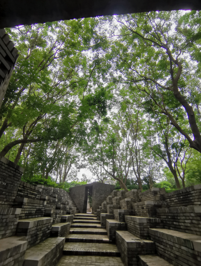 槐谷之槐——是其两侧土山上广植槐树的浓荫意象,它是对冯纪忠设计的方塔园石堑道的复述.当日与童明仰视堑道上空遮天蔽日的香樟密林,忍不住在石阶上静坐良久,曾思及如何为这处迷人之道设置暂时逗留的坐具。这一思考,造就了槐谷之谷如今上大下小的意象,它将美术馆圆庭的错落踏步拉宽变长,以提供攀爬上山或逗留落座。我将适于北方生长的槐树,替代了方塔园堑道两侧的南方香樟、我期待它们的树荫将覆盖整个槐谷。