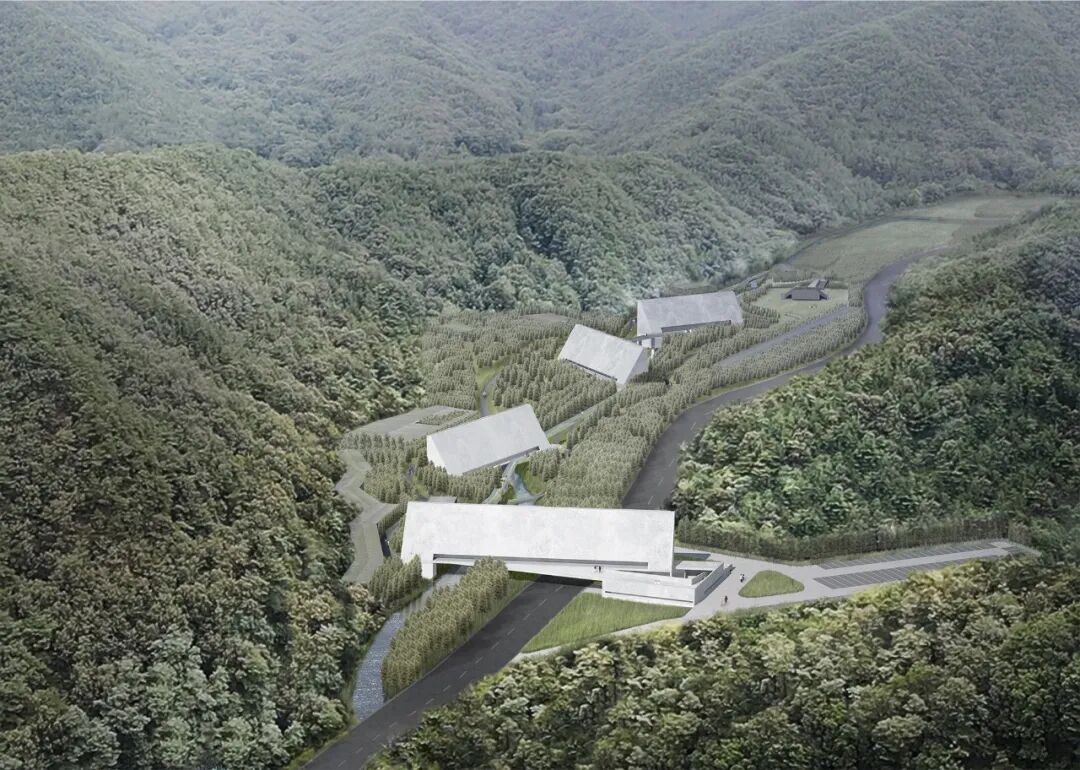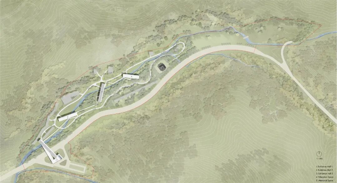 设计解读 项目背景 2020年下半年,在韩国内务安全部的支持下,大田东固区(Dong-gu district in Daejeon)地方政府发起了纪念朝鲜战争中的平民受害者和遇难家庭的国家纪念公园国际设计竞赛。竞赛的目的是设计一座“纪念公园”,成为韩国国家和平的象征,以纪念朝鲜战争中的平民受害者,并为他们中的死者家属提供一些慰藉。 该项目由两个主要部分组成:纪念馆是帮助人们了解冲突历史的地方;开放式公园是一个提供教育、展览、交流、纪念和休息等多种活动和目的的开放式公园,可以在向市民开放的基础上,了解包括过去发生在选址场地上的悲惨事件在内的独特语境。 本次竞赛共587组参赛团队,通过两轮评审,最终选出10名获奖者,何东明工作室的设计方案“The Bridge”是本次竞赛的四等奖作品。 项目解读 项目位于大田市东侧,为朝鲜战争平民遗骸发掘区域,场地处于山脉环绕的盆地内,植被茂密,周边有着丰富的地景要素:山川、河流、森林,这些原生的自然要素是我们对场地最直接的认知。纪念馆作为该地块的文化建筑,不仅承担着对历史事件的展示与宣传,更多的是为公众提供了一个纪念生命、珍视和平的体验场所,那么,如何让纪念空间嵌入场地与环境融合,营造历史叙事的场所?这成为我们设计思考的起点。 设计概念 战争遗留的创伤铭刻在大地之中,时空演变,山川不息,唯有河流亘古不变的流淌,它默默见证着生命的流逝与生长,承载着战争给无辜平民带来的痛苦和人们对和平的追求与向往。如果摒弃信仰,文化等意识冲突,和平是人们与自然共生秩序的反映。于是,设计以贯穿场地的“河流”为线索,将和平之“桥”跨越河流、悬浮于场地之上,并连接两侧散落的遗址,分散的“桥”作为展厅静默于周边片植的黑松林中,市民通过廊道穿越展厅并抵达下沉的纪念空间,静谧而幽长地体验着这段沉寂的历史。 ©何东明工作室/domarchitects(中建三局集团有限公司) ©何东明工作室/domarchitects(中建三局集团有限公司) ©何东明工作室/domarchitects(中建三局集团有限公司) ©何东明工作室/domarchitects(中建三局集团有限公司) 空间生成 展览空间悬置于河流之上,并通过13m高的承重墙在四周进行围合,形成内部狭长高耸的展览空间;其次,建筑两端的核心筒落地,形成支撑上部“桥面”的“桥墩”;最后,建筑通过局部出挑形成半开放的观景平台。 ©何东明工作室/domarchitects(中建三局集团有限公司) ©何东明工作室/domarchitects(中建三局集团有限公司) 纪念空间通过置于片墙之上的悬浮挑檐,形成四面围合的内部空间;之后,在檐口四角设置开口,形成可供人们进入的檐下空间;最后,设计在建筑下部植入地下室,将游客引入地下进入通高的纪念空间内,从而营造静谧、庄严的纪念氛围。 ©何东明工作室/domarchitects(中建三局集团有限公司) ©何东明工作室/domarchitects(中建三局集团有限公司) ©何东明工作室/domarchitects(中建三局集团有限公司) ©何东明工作室/domarchitects(中建三局集团有限公司) 功能分区 在功能分区上,本案设计共分为三大片区,分别是展览教育区、纪念区和娱乐区。展览教育区集中在场地西侧,临近现状遗址坑,主要包括展览空间、教育空间、遗址保护空间和办公空间;纪念区位于场地中部,主要为地下纪念空间和局部展厅;娱乐区则位于场地东侧,主要为市民休闲娱乐的活动公园。 流线组织 在流线组织上,本案采用双流线灵活转换的形式。游客通过位于场地西南角停车场的建筑主入口进入首栋展览建筑后,即可通过建筑之间的栈道前往下一栋展馆,亦可通过垂直交通到达园区地面,通过休闲步道前往各遗址保护大厅进行参观,之后再通过其他展馆的垂直交通进入二层展厅进行观展。地面步道与空中栈道转换灵活,方便。 ©何东明工作室/domarchitects(中建三局集团有限公司) ©何东明工作室/domarchitects(中建三局集团有限公司) ©何东明工作室/domarchitects(中建三局集团有限公司) 建造材料 设计在建造材料上进行了多样的运用,给场地提供了更丰富的观览体验。首先,展馆主体建筑在材料上采用白色清水混凝土,塑造厚重深沉的内部空间体验,外部坡道上铭刻遇难者姓名的序列;遗址大厅则运用火烧木作为建筑立面材料,营造出战争带来的创伤与痛苦的痕迹;纪念空间的地上檐口运用黑色混凝土,塑造静穆庄严的空间氛围;园区内部的空中栈道选择了漫射铝板,它能更好地融合场地内黑松林的色彩,既能将栈道隐匿于场地之中,也可以营造出“漂浮轻盈的空中连廊”,与幽深的展厅形成强烈对比,形成历史与当下的对话。 ©何东明工作室/domarchitects(中建三局集团有限公司) ©何东明工作室/domarchitects(中建三局集团有限公司) ©何东明工作室/domarchitects(中建三局集团有限公司) 技术图纸 ©何东明工作室/domarchitects(中建三局集团有限公司) ©何东明工作室/domarchitects(中建三局集团有限公司) ©何东明工作室/domarchitects(中建三局集团有限公司) ©何东明工作室/domarchitects(中建三局集团有限公司) ©何东明工作室/domarchitects(中建三局集团有限公司) 项目名称:朝鲜战争死伤平民纪念公园国际设计竞赛 项目地点:韩国大田市 造价:259亿韩元 设计单位:何东明工作室/domarchitects(中建三局集团有限公司) 用地面积:98601㎡ 建筑面积:3798.22㎡ 主创建筑师:何东明 设计团队完整名单: 何东明、张培东、闫州、陈雨