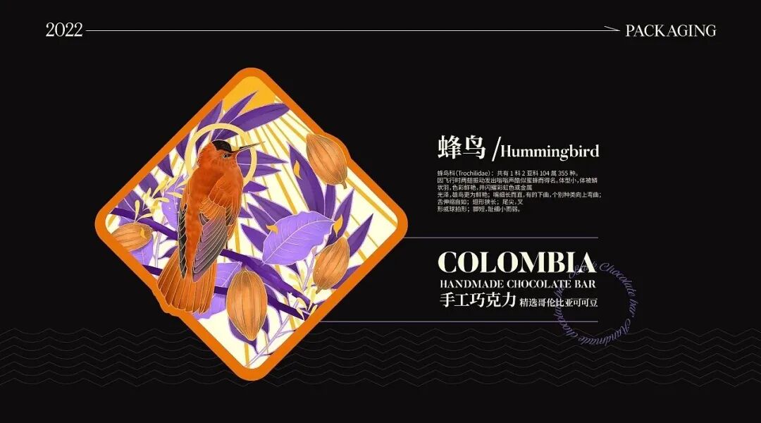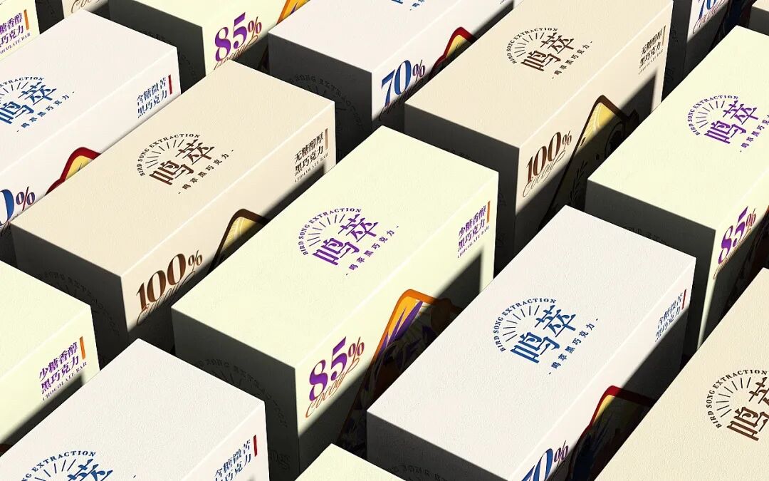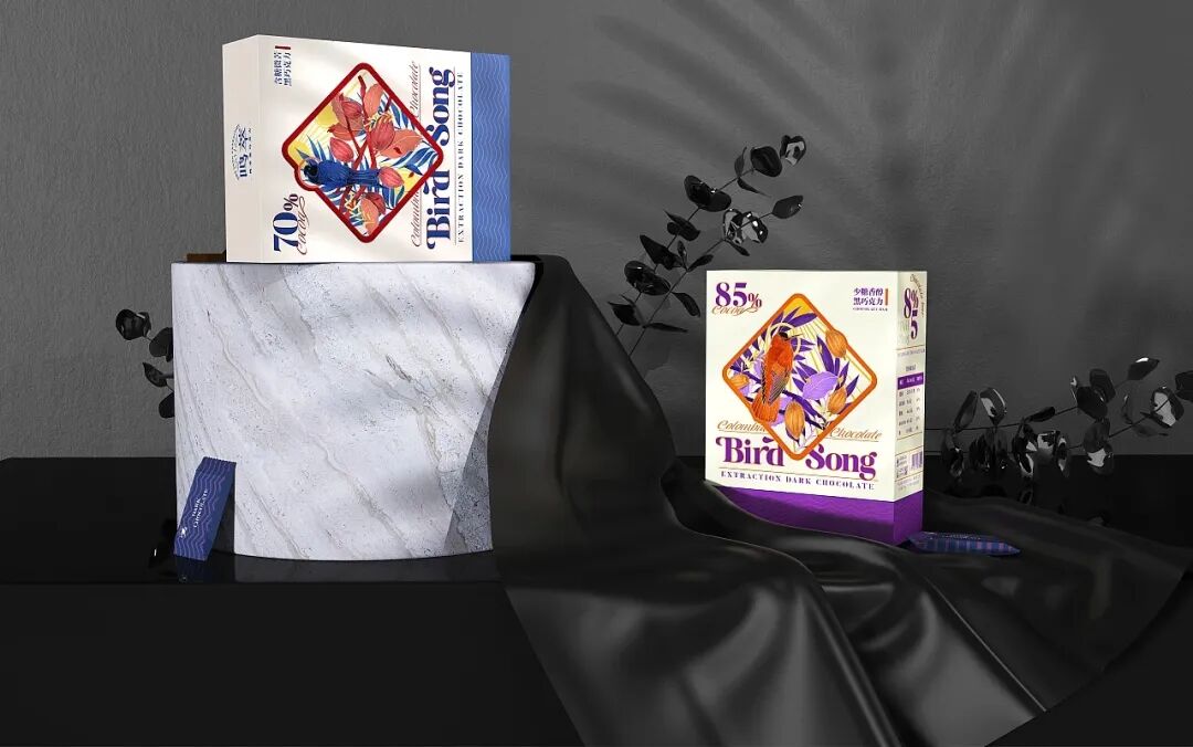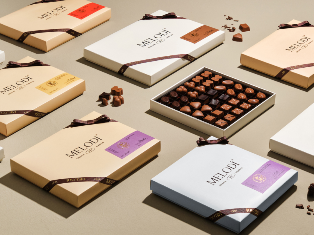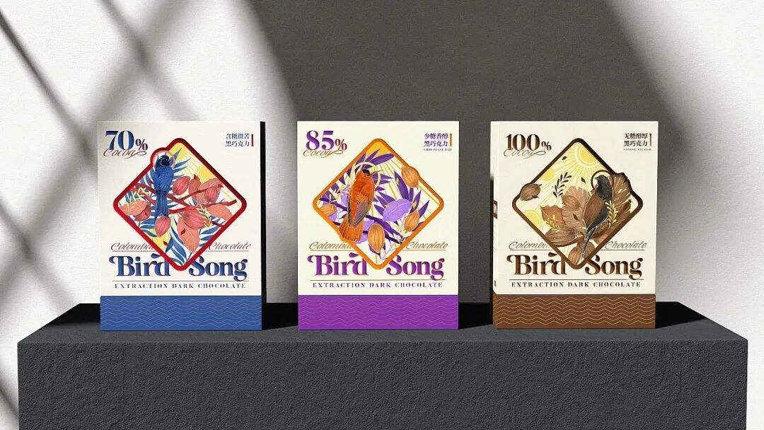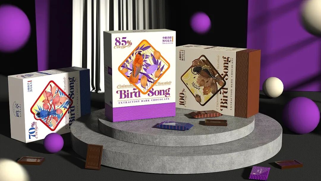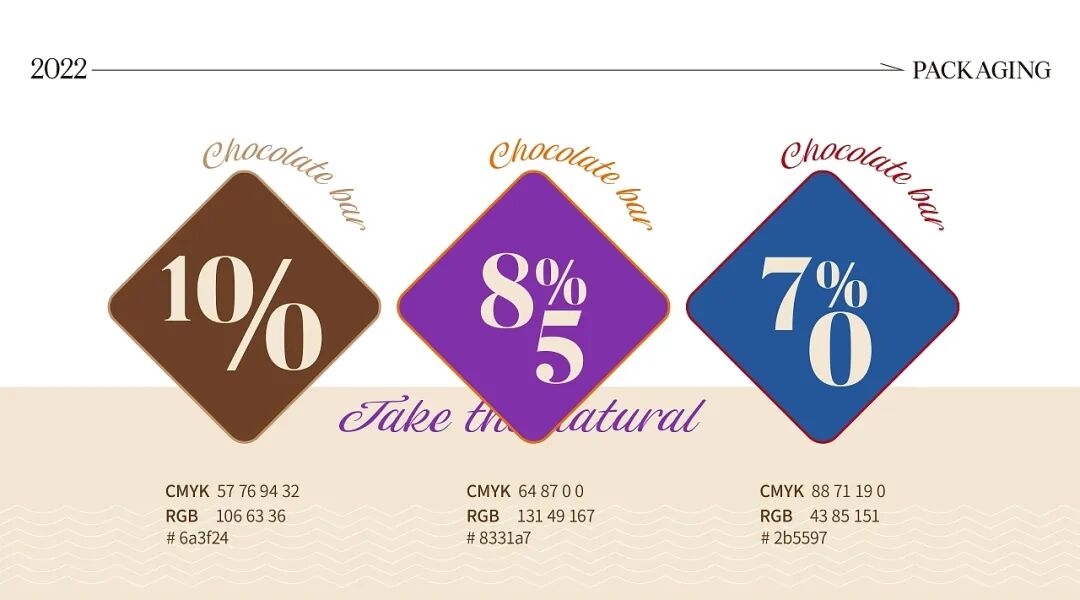 巧克力的包装设计,往往在色彩方面制造亮点,无需过多的图文修饰,简单的品牌名+色彩渲染就能起到让人眼前一亮的效果。