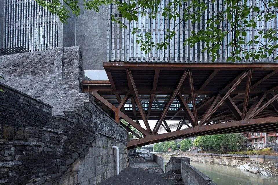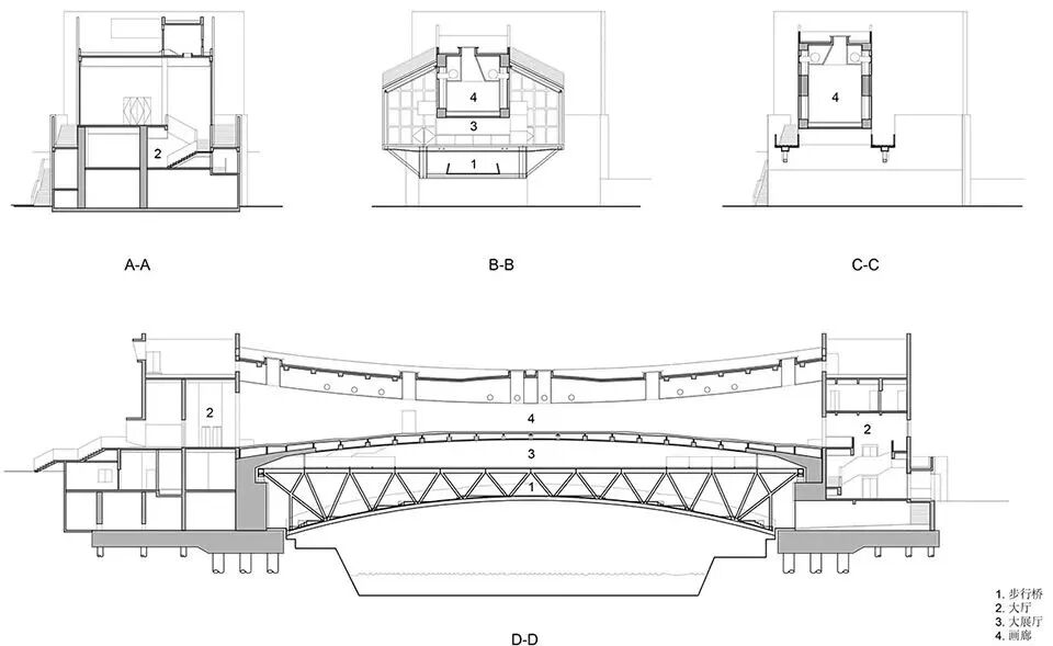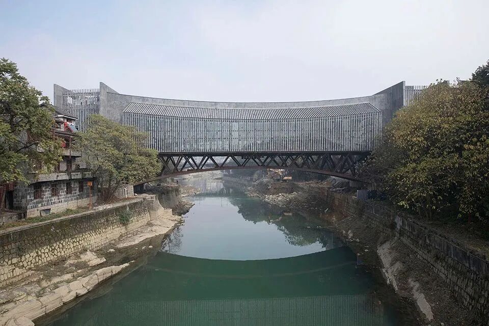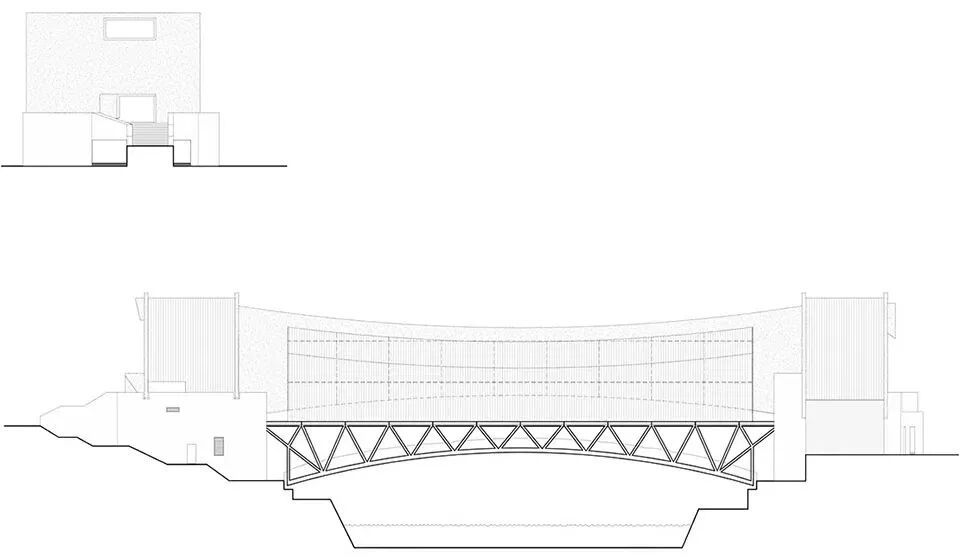 美术馆以桥上桥的形式构成。下层的钢桥是开放的桁架结构,为行人通过提供了一个带顶的街道,同时也助于疏导洪流;上层的现浇混凝土拱桥内部设有画廊。两桥之间是一个由玻璃幕墙和筒瓦遮阳系统围合而成的大展厅,用于举办临时展览。