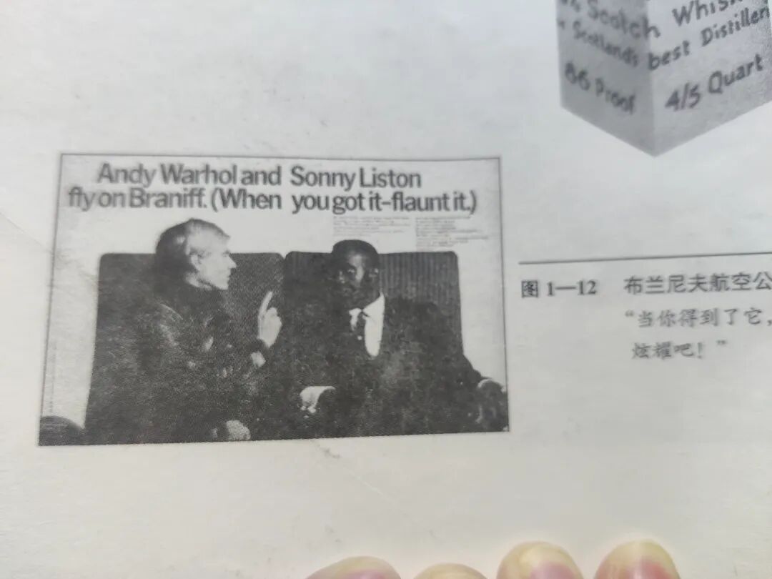 这时镜头拉开,可以看到利斯顿正坐在一个大块头的、脸色阴沉的黑人旁边,这时画外音说道:喋喋不休的沃霍尔和桑尼利斯顿经常搭乘布兰尼夫航空公司的班机。他们喜欢我们的食物、我们的空中小姐以及我们的风格,他们也喜欢我们飞机的准时。各位,谢谢搭乘布兰尼夫航空公司的班机。”