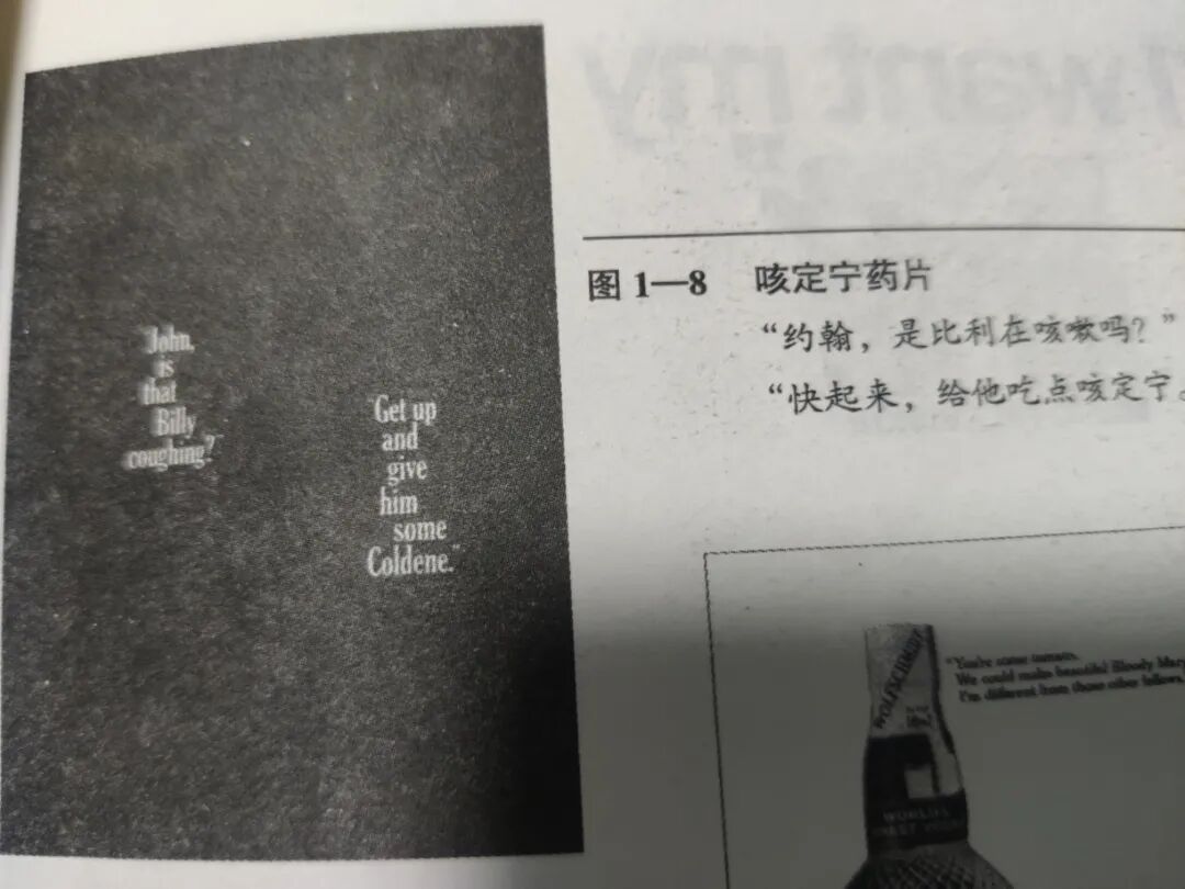 广告中没有出现产品、包装、标识、也没有成分说明,仅仅黑色背景加字幕,呈现在卧室中,一对睡觉的夫妇被他们不断咳嗽的孩子吵醒了的情景。