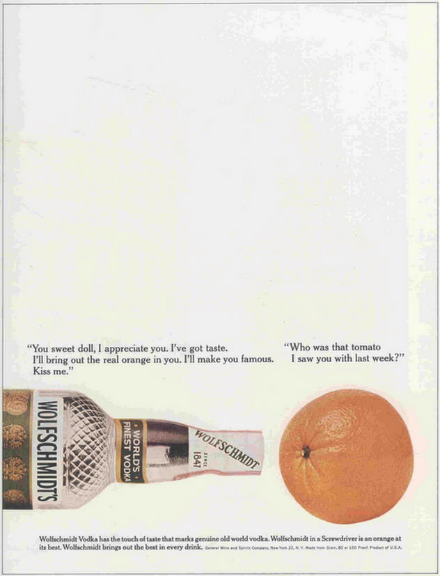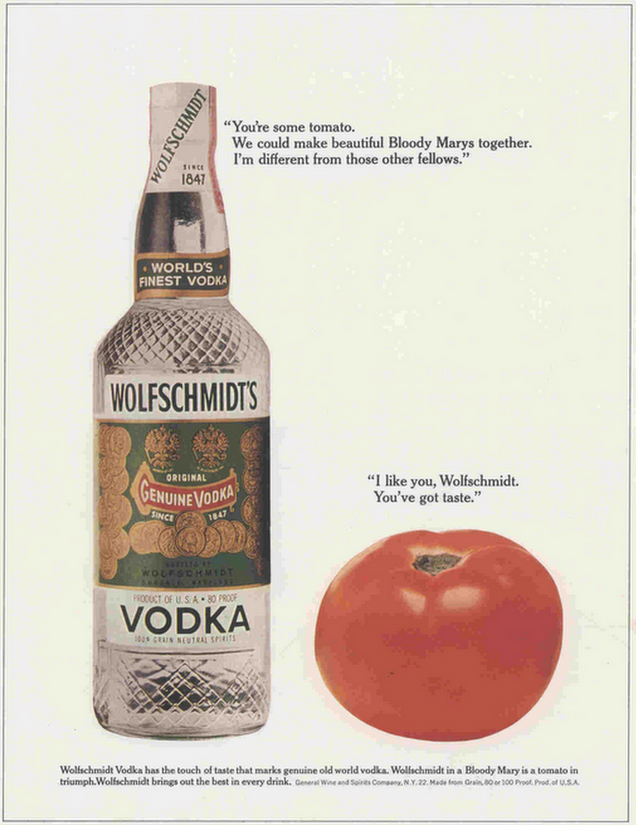 广告内容为一个竖着的沃尔夫史密特伏特加酒瓶和旁边一个肉感多汁的红番茄的对话。
