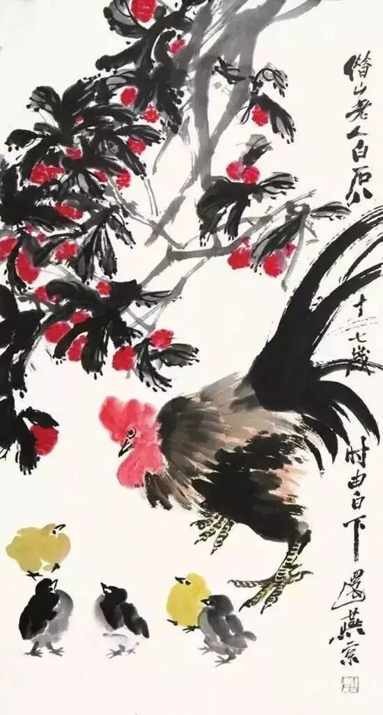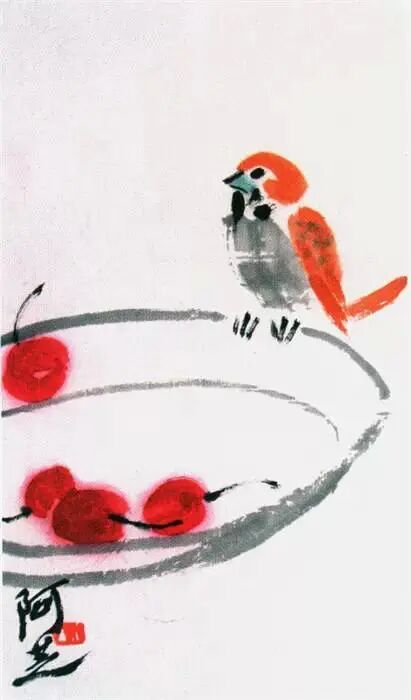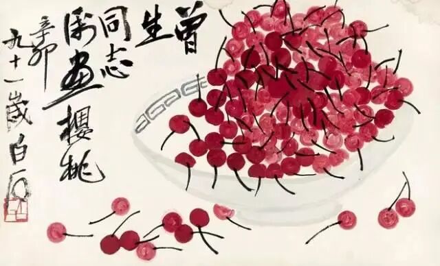初夏的时节,老爷子端了一盘樱桃,坐在自家四合院的葡萄架下,美美地品尝这美味。吃满足了,还剩下几颗,就放在了屋外的桌子上,撩起门帘,进了屋。正准备提笔画点什么,往屋外一看,呦,一只小鸟站在盘子上,正要偷偷来一颗。好!就画这个情景,多有趣!时间可以过去,但画笔凝固的场景和心情却一直留下来,予人回味!