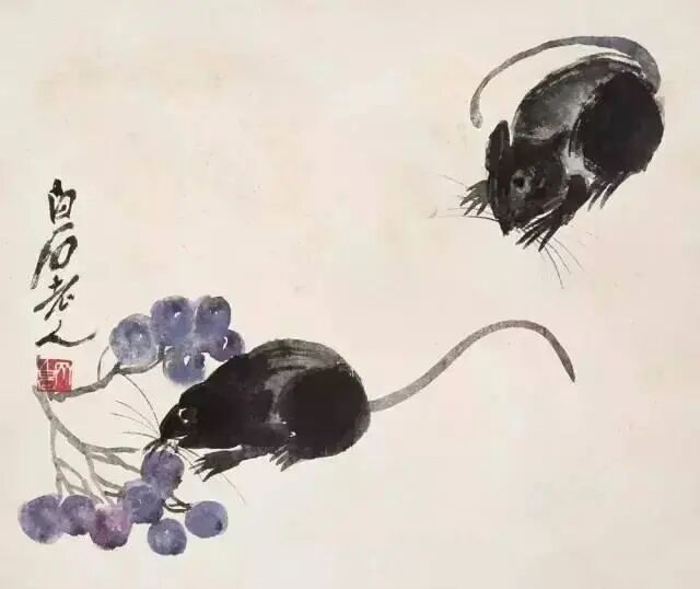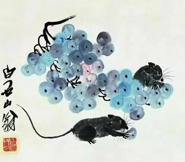 白石老人常画葡萄,葡萄籽多,因而寓意“多子多福”。藤条、墨叶之间,晶莹剔透,犹如一串串紫色的明珠,呈现出旺盛的生机,也营造了画面明朗乐观的基调。