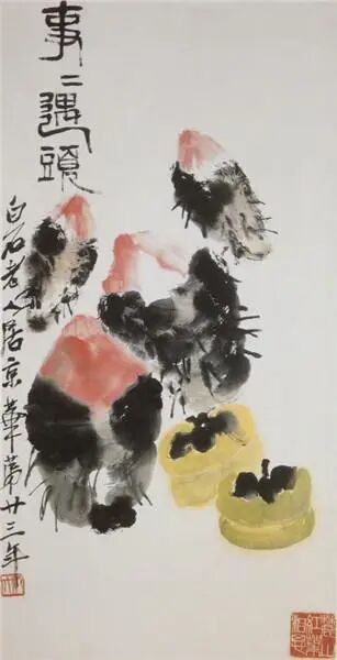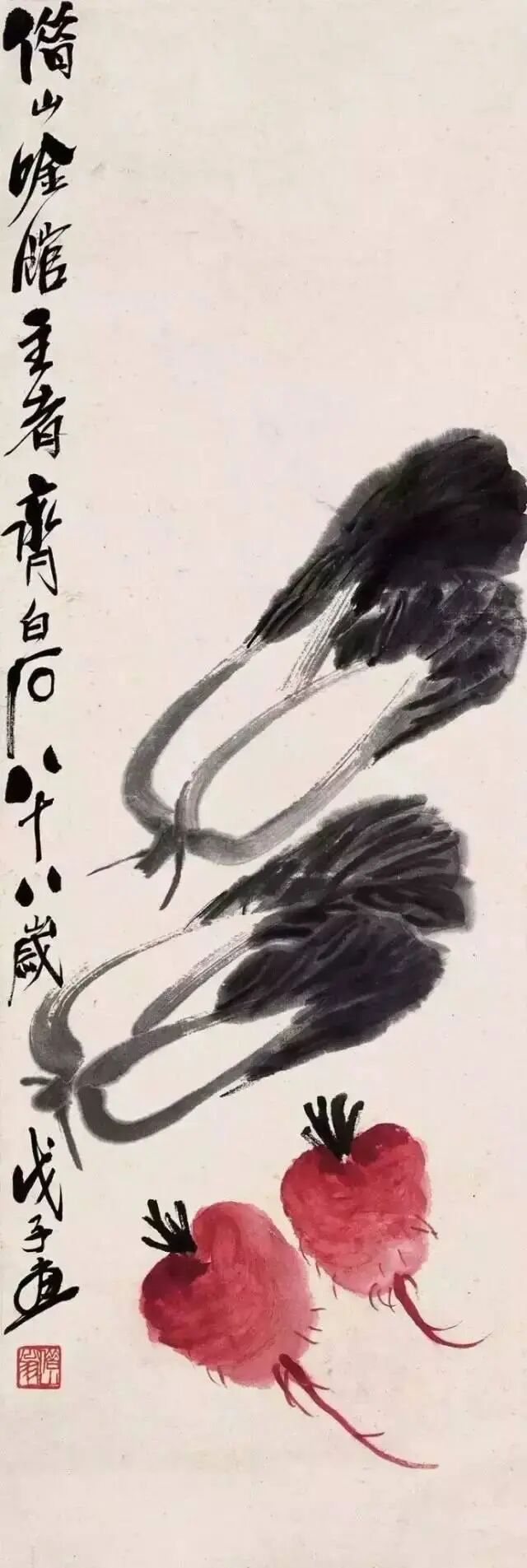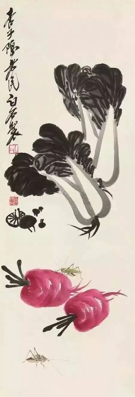 在齐白石众多的绘画题材中蔬果类作品是最能触及老人思乡情结的一类,他将这些日常所见之物,寄予了深层精神内涵,超越了绘画的内容和形式。齐白石最爱画各种蔬菜都是他从小就吃过、种过的东西,牵系着他的儿时记忆与乡思。
