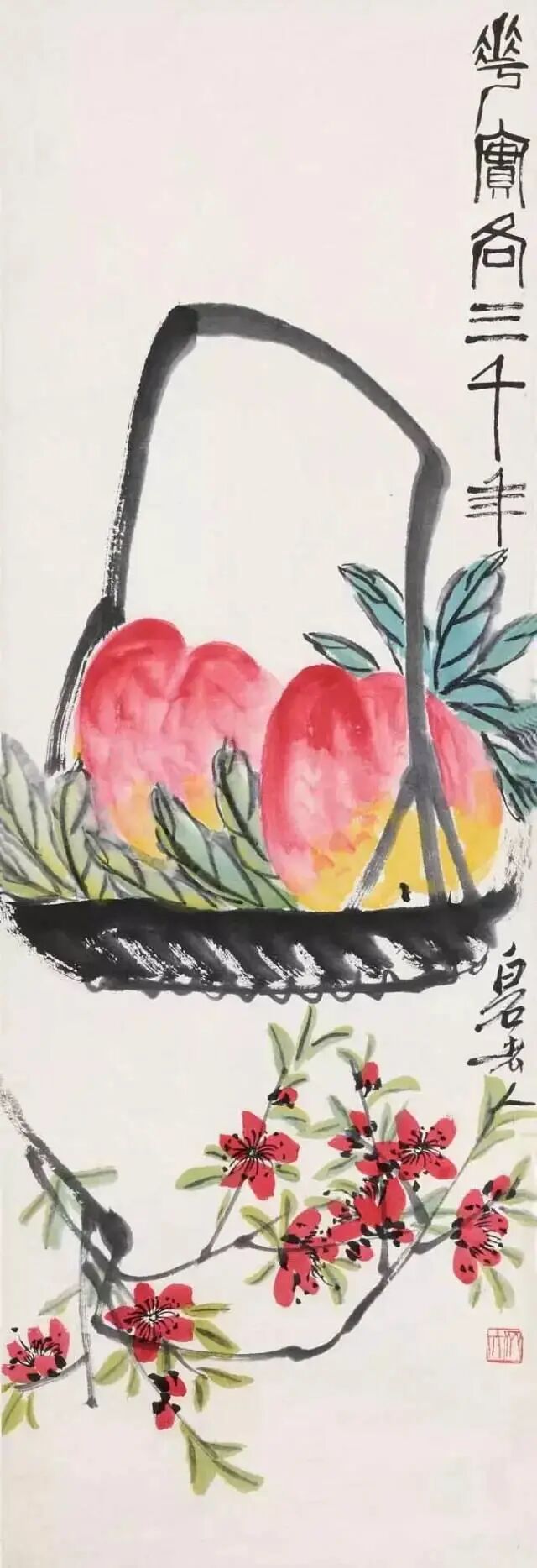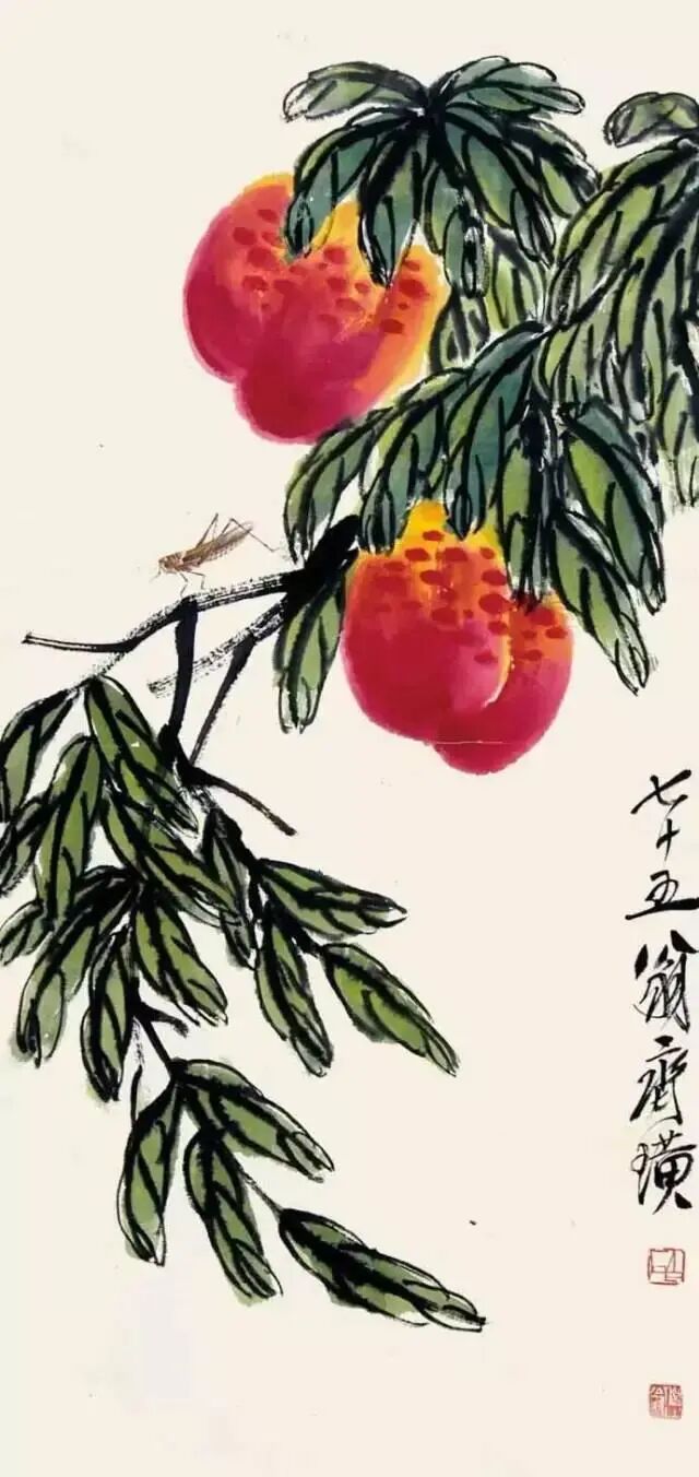 齐白石画桃,先以没骨大写意法直接用洋红泼写硕大桃实,渗以少许柠檬黄,再以花青、赭墨写出叶子和枝干,后用浓墨勾勒叶筋,设色浓重艳丽。与其画荷花所创的红花墨叶恰成强烈对照。