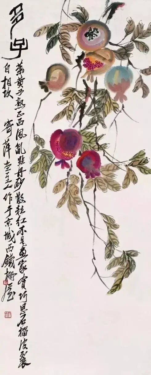 中国人视石榴为吉祥物,以为家族兴旺、多子多福的象征。北京画院藏有一幅齐白石1922年作的《石榴》,这已是他在北京定居的第三个年头。对家乡的思念,对亲人的眷恋,时刻萦绕他脑中,对那些曾经维持自己和家人生计的蔬果,他依然难忘——“充肚者胜半年粮,得志者勿忘其香”、“饱谙尘世味,尤觉菜根香。”