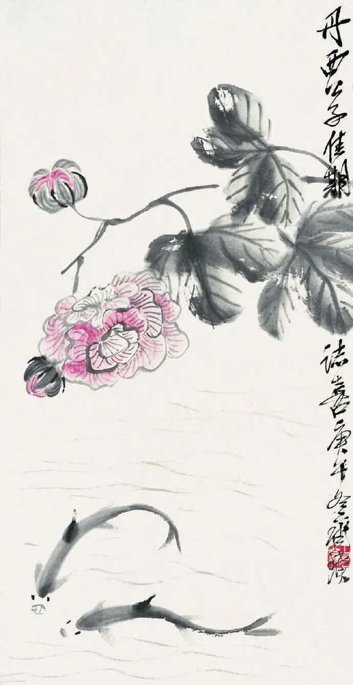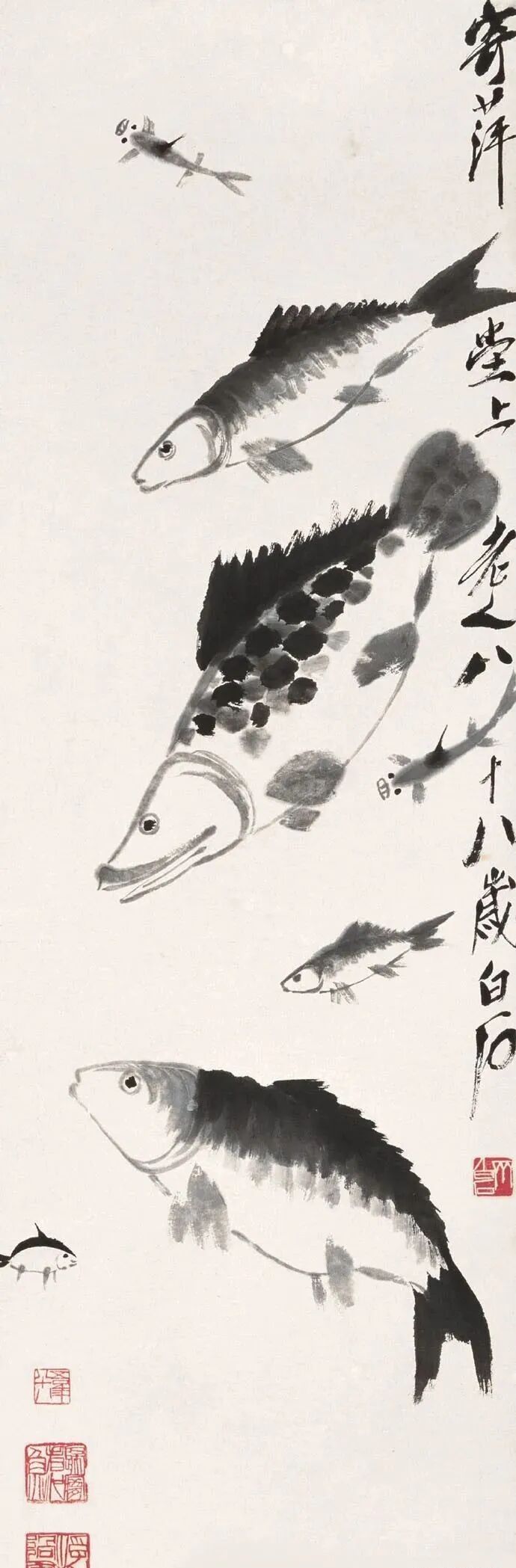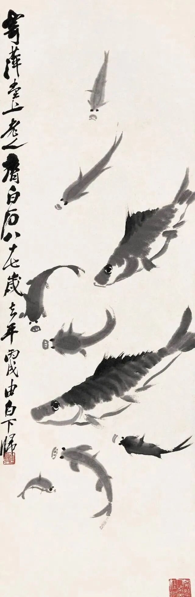 齐白石继承了八大山人的画法,而且还在自己的齐派画法上增加鱼的童趣味,一条简单的鱼,在齐老先生的笔下却是变得非常有趣味性,哪怕是没有画水,也仍旧可以感受到鱼儿在水中自由游动的场景,这可能就是大师的功力吧。