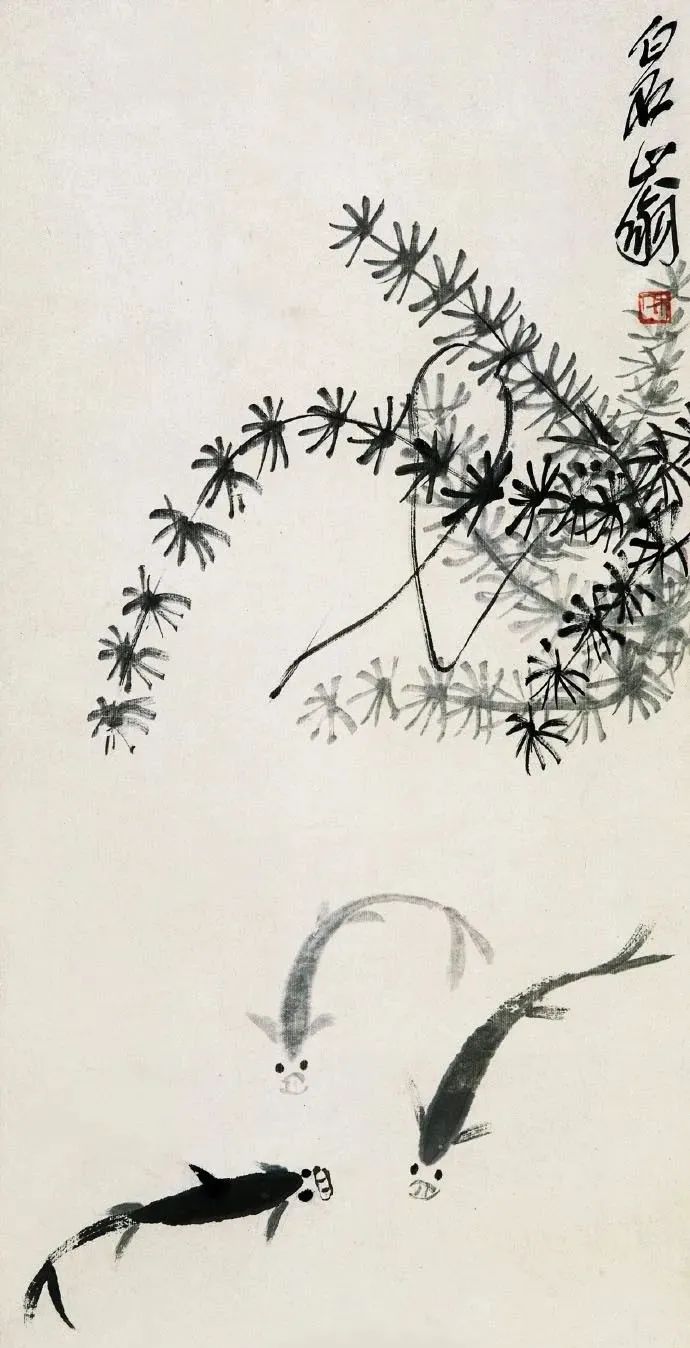 细观齐白石画的鱼,如鱼得水,形容齐白石画鱼用这一句话再合适不过了。齐白石画鱼从不画水,而且把无形与有形这一个互补的概念组合得非常完美。