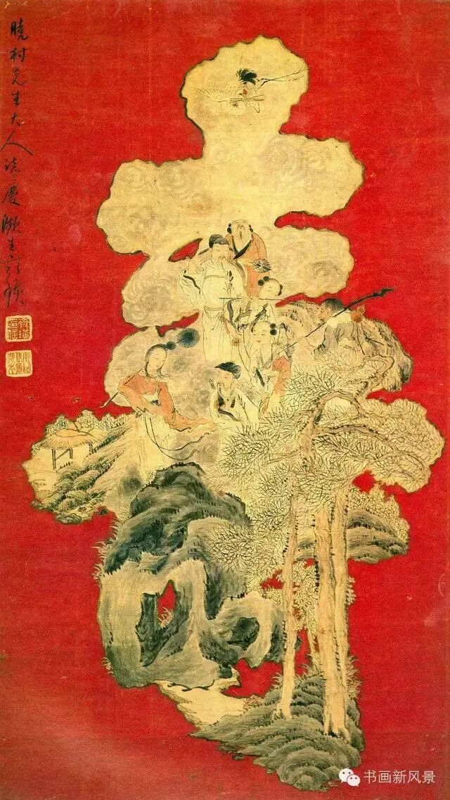 这是30来岁的齐白石创作的一幅作品,此时的齐白石还没去过湘潭县城,在乡间卖画为生,买画的主顾多为乡绅。这幅以人物、山水组成的“寿”字,是民间艺术的典型样式,取“群仙祝寿”之意。