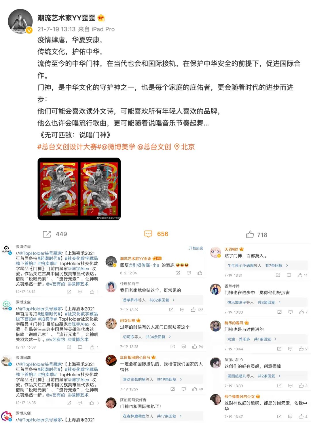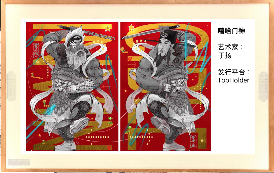 此拍品为《嘻哈门神》原作创作人于扬对该作品进行数字化并通过微博平台发布后,委托TopHolder上链生成的具有唯一标识的数字藏品。创作人歪歪的门神系列作品数字化后与粉丝的开放互动,一起共同表达了对中国神话喜爱,也是对古代文化的潮流再创新。
