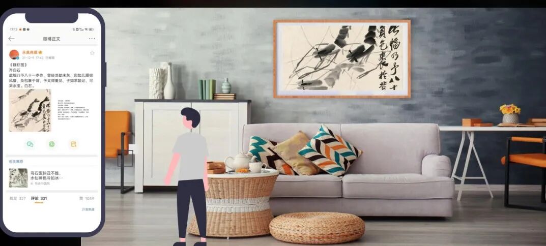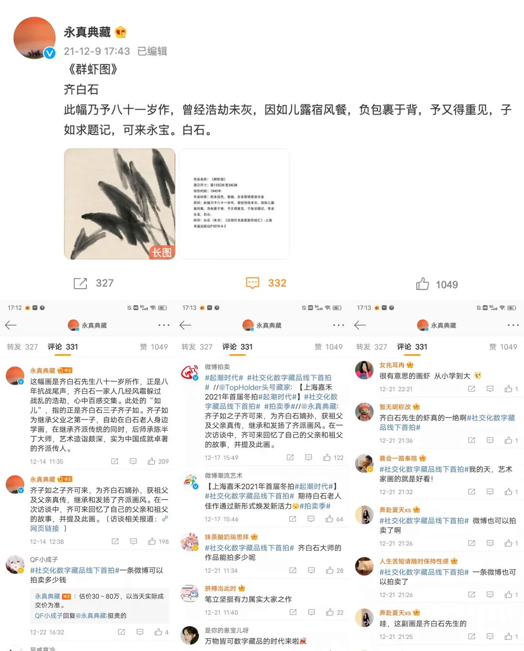 此拍品为齐白石《群虾图》原作藏家对该作品进行数字化并通过微博平台发布后,委托TopHolder上链生成的具有唯一标识的数字藏品。此系齐白石画作首次数字化尝试。藉此,微博用户将可在微博平台进⾏⼴泛的社交互动,赋予传统国粹艺术数字化新生命。